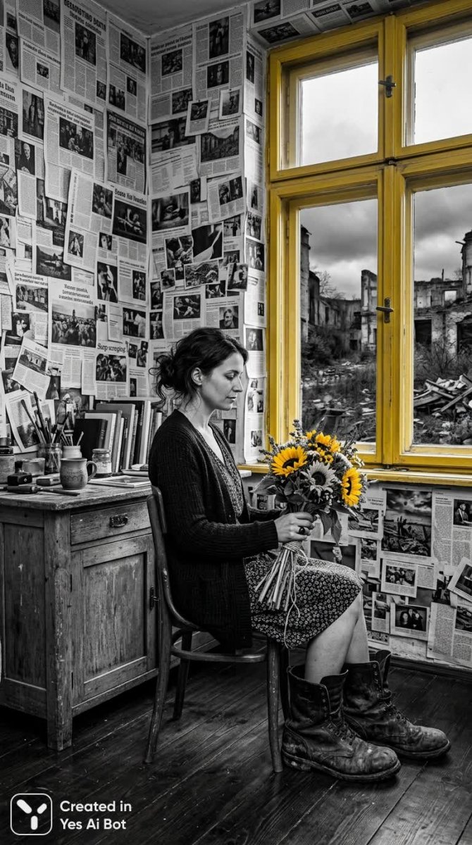 На изображении запечатлена женщина, излучающая спокойствие и внутренний свет, сидящая в кресле с букетом желтых подсолнухов. Её образ резко контрастирует с окружающим интерьером: просторная комната с массивным сервантом, стены которой украшены коллажем из черно-белых газетных вырезок, создающих интеллектуальную и прохладную атмосферу. На полу видны большие ботинки, добавляющие образу небрежности. Окна с желтыми рамами устремлены вверх, открывая вид на заброшенный мир, что создает ощущение изоляции. Композиция представляет собой концептуальный коллаж, сочетающий реальность и сюрреализм, прошлое и настоящее. Фотография выполнена в черно-белых тонах, вызывая размышления о хрупкости жизни и красоте природы. Вся сцена пронизана загадочностью и меланхолией, а игра цветов и текстур придает ей выразительность. Женщина предстает как символ стойкости духа и надежды в заброшенном мире, хранящем память о прошлом эпохах. Изображение создано нейросетью Nano Banana v.2.0 в стилях реализма и детализации.
