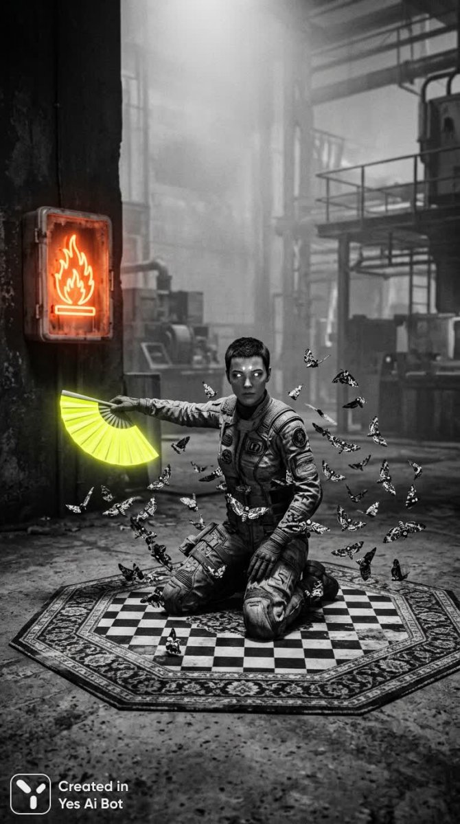 Молчаливая элегантность и тревожное напряжение сплетаются в этом сюрреалистичном черно-белом изображении. Женщина с короткой стрижкой, облаченная в безупречно сшитый костюм, опускается на колени перед шахматным ковром необычной восьмиугольной формы. Вокруг нее клубится рой черных и белых мотыльков, стремящихся вверх словно души, освобожденные от земного притяжения. В ее вытянутой руке зажат ярко-желтый веер – символ хрупкости и защиты в этом безжалостном пространстве. Взгляд женщины устремлен вперед, рассеянный ослепительным светом, исходящим от неоновой подсветки корпуса аварийного выхода. Это свет надежды или сигнал опасности? Фон погружен в туманную дымку индустриального помещения, лишенного четких контуров и деталей, что создает ощущение изоляции и надвигающейся угрозы. Двойной удар яркости света пронзает ее глаза, подчеркивая внутреннее смятение и подавленность. Фотография завораживает своей контрастностью: строгий силуэт женщины в идеально скроенном костюме и хаотичный полет мотыльков, холодный блеск неоновых огней и туманная загадочность фона. Это современное произведение искусства передает чувство отчуждения, внутренней борьбы и хрупкости человеческого духа перед лицом неизвестного. Композиция, игра света и тени, а также сюрреалистические элементы создают атмосферу тревоги и меланхолии, заставляя зрителя задуматься о скрытых смыслах и символизме этого необычного снимка. Кажется, будто женщина замерла в момент принятия сложного решения или столкнулась с неразрешимой дилеммой