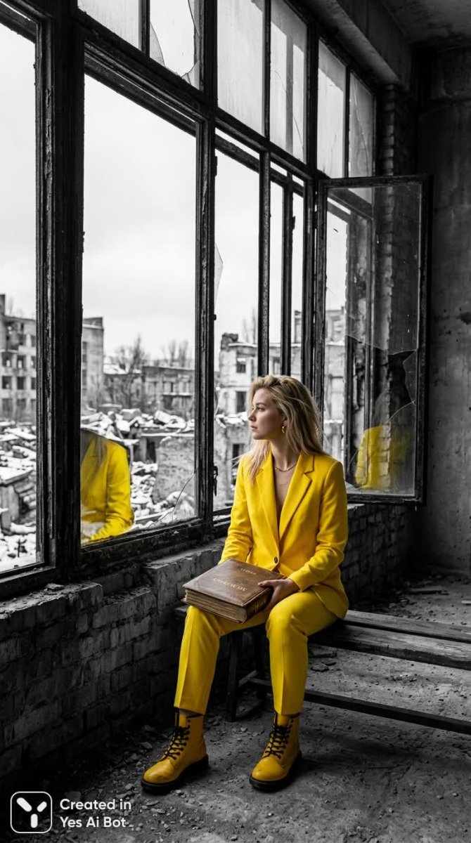 young woman with short blonde hair seated before large dilapidated windows indoors, family album near, yellow suit and boots radically vivid, black-and-white ruins, outside world cold and grey, thoughtful expression, selective color stylish reflections, contemporary surreal bw photo