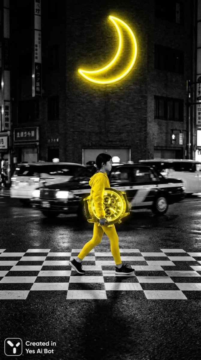 Завораживающая черно-белая фотография в стиле сюрреализма переносит зрителя в мир невозможного. В центре композиции – девушка, уверенно шагающая по шахматной улице в ярком желтом спортивном костюме. Ее руки держат огромные желтые наручные часы, бросающие вызов привычным представлениям о времени и масштабе. На заднем плане размываются силуэты черно-белых автомобилей, словно застывшие в пиксельном движении, создавая ощущение цифровой реальности. Атмосферу нереальности подчеркивают неоновые вывески, образующие причудливый фон, где единственным ярким акцентом выступает луна, сияющая ослепительно-желтым светом. Эта современная сюрреалистическая фотография – визуальная загадка, приглашающая к размышлениям о природе реальности и восприятия. Контраст между черно-белой основой и ярким желтым цветом усиливает эффект неземной красоты и создает ощущение дежавю. Изображение воплощает в себе динамику современного города, искаженную через призму фантазии и цифровых технологий. Это не просто фотография – это портал в альтернативную вселенную, где границы между реальностью и сном стираются, а каждый элемент несет в себе скрытый смысл. Кажется, будто девушка идет навстречу неизведанному будущему, в котором время подчиняется лишь ее воле