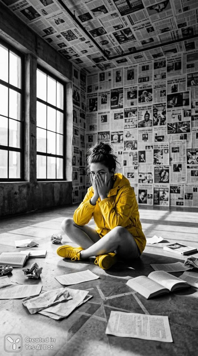 Завораживающий образ молодой женщины, застывшей в моменте задумчивости на фоне сюрреалистичного пространства. Её небрежный пучок и яркий желтый жакет контрастируют с монохромной палитрой окружающего мира, создавая динамичный визуальный эффект. Яркие желтые кроссовки добавляют нотку современности и игривости в эту атмосферу меланхолии и размышлений. Абстрактный пол, стены и потолок украшены коллажем из черно-белых газетных вырезок, словно страницы истории, застывшие во времени. Естественный свет, проникающий сквозь большие окна, мягко освещает сцену, подчеркивая игру света и тени на лице женщины, прикрытом руками. Разбросанные повсюду страницы книг намекают на интеллектуальную деятельность и погружение в мир знаний. Селективное использование желтого цвета в черно-белом фоне создает эффект неожиданного акцента, усиливая эмоциональное воздействие изображения. Хаотичные контрасты монохромной палитры и ярких цветовых деталей добавляют глубины и сложности композиции. Эта современная черно-белая фотография завораживает своей сюрреалистичностью и приглашает зрителя к размышлениям о времени, памяти и человеческом состоянии. Вся сцена пронизана ощущением уединения и внутренней сосредоточенности, представляя собой визуальную поэму о красоте в хаосе и поиске смысла в окружающем мире