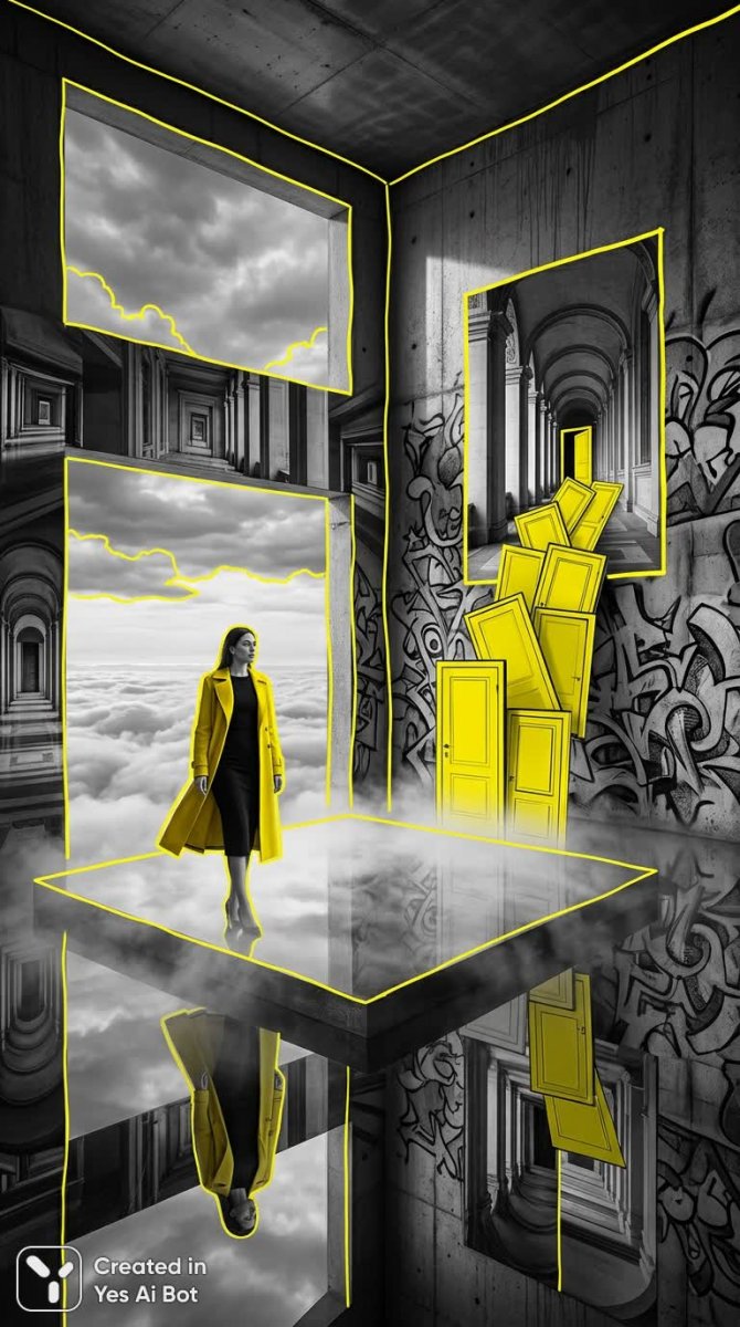 Завораживающая сюрреалистическая фотография представляет собой причудливую смесь реальности и фантазии. В центре композиции – женщина в ярких желтых колготках, грациозно восседающая на туманном полу, создающем ощущение невесомости и неземной атмосферы. Архитектурные элементы искажены зеркальным отражением, добавляя картине дополнительный слой загадочности и деформации пространства. Неожиданный элемент – желтая дверь, прорывающаяся сквозь строгие черно-белые коридоры, выполненные в классическом стиле. Этот контраст между ярким цветом и монохромной гаммой усиливает ощущение сюрреалистичности и нарушает привычные представления о реальности. Стены украшены причудливыми текстурами граффити, создающими впечатление хаотичного, но одновременно гармоничного сочетания различных стилей и форм. Фоном служит затянутое облаками небо, которое словно проступает сквозь стены, добавляя изображению глубины и драматизма. Контуры объектов подчеркнуты необычными яркими выделяющимися маркерами и контрастными линиями, создавая ощущение движения и динамики. Вся композиция выполнена в современной манере черно-белой фотографии, что позволяет сосредоточиться на игре света и тени, текстурах и формах, усиливая общее впечатление от сюрреалистического изображения. Фотография обладает сильной визуальной выразительностью и заставляет зрителя задуматься о природе реальности и восприятия. Это произведение искусства – настоящий вызов традиционным представлениям о фотографии и изобразительном искусстве в целом