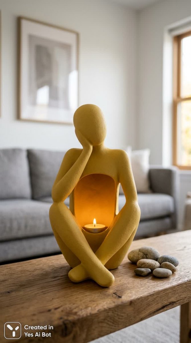 vase resembling seated pensive human, matte yellow ceramic texture, hollow core showing lit candle, small stones arranged beside, foreground wooden plank, blurred background with sofa and art-frame, golden soft day illumination, modern minimal interior