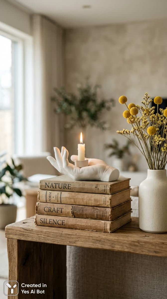 white matte sculpture shaped like hand supporting a small candle, next to cream vase with yellow dried sweets befallower, placed on vintage books, thrilling minimalistic casc lifesc bg, debris soft lighting ut modern harmonig BG.
