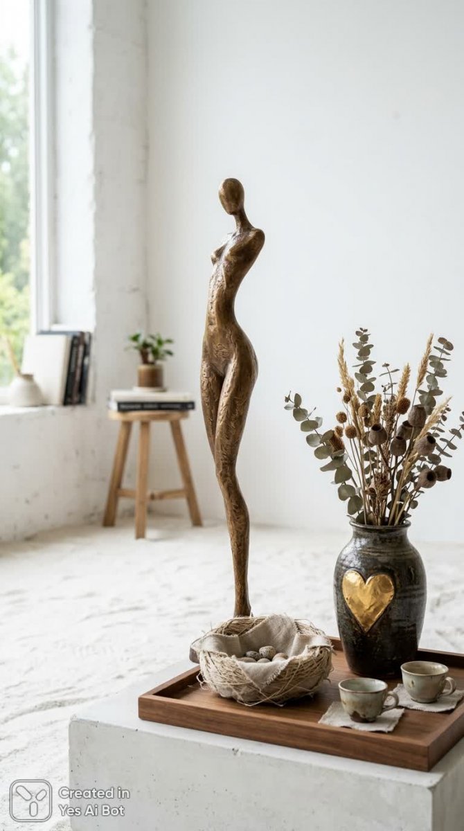 abstract standing human sculpture, warm bronze texture, vase embedded with golden heart, surrounded by arr herself tick teacs, nest form fabric on tray, soft daily light invading studio fo tribe high definition phot yet cool, tranquil side takelectic style, white bg sandy.