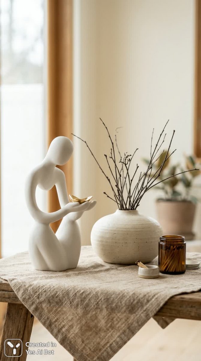 white abstract human sculpture holding small golden object, low oval cream ceramic vase with twigs, matches jar, arrangement on textured sand-colored cloth, soft light on curved forms, calm lifestyle still, artistic high-res style