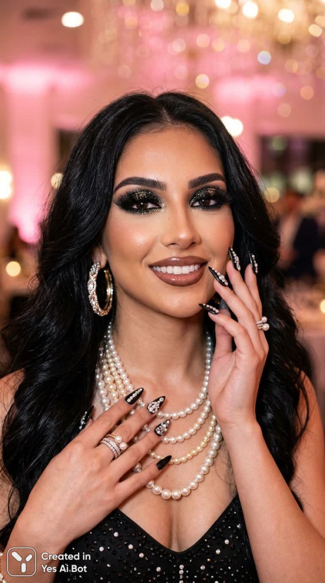 Роскошный портрет эффектной женщины, воплощающей в себе элегантность и гламур. Длинные черные волосы служат обрамлением для лица, на котором выделяется драматичный макияж глаз с использованием мерцающих теней и объемных ресниц. Многослойные жемчужные ожерелья и крупные кольца подчеркивают изысканность образа, а длинные черные ногти, украшенные стразами, добавляют нотку дерзости и роскоши. Акцент сделан на лице и руках модели, демонстрируя безупречную детализацию и мастерство исполнения. Мягкое розовое свечение на заднем плане создает атмосферу загадочности и утонченности, подчеркивая красоту объекта съемки. Это яркий пример современной модной фотографии, отличающейся высоким качеством изображения и вниманием к деталям. Вся композиция пронизана духом роскоши, уверенности в себе и безупречного стиля, создавая незабываемый визуальный образ женщины, которая знает себе цену и умеет эффектно себя подать. Фотография передает ощущение праздника и торжественности, идеально подходя для использования в модных журналах или рекламных кампаниях люксовых брендов. Изображение излучает энергию и вдохновение, призывая к воплощению собственных амбиций и стремлению к совершенству