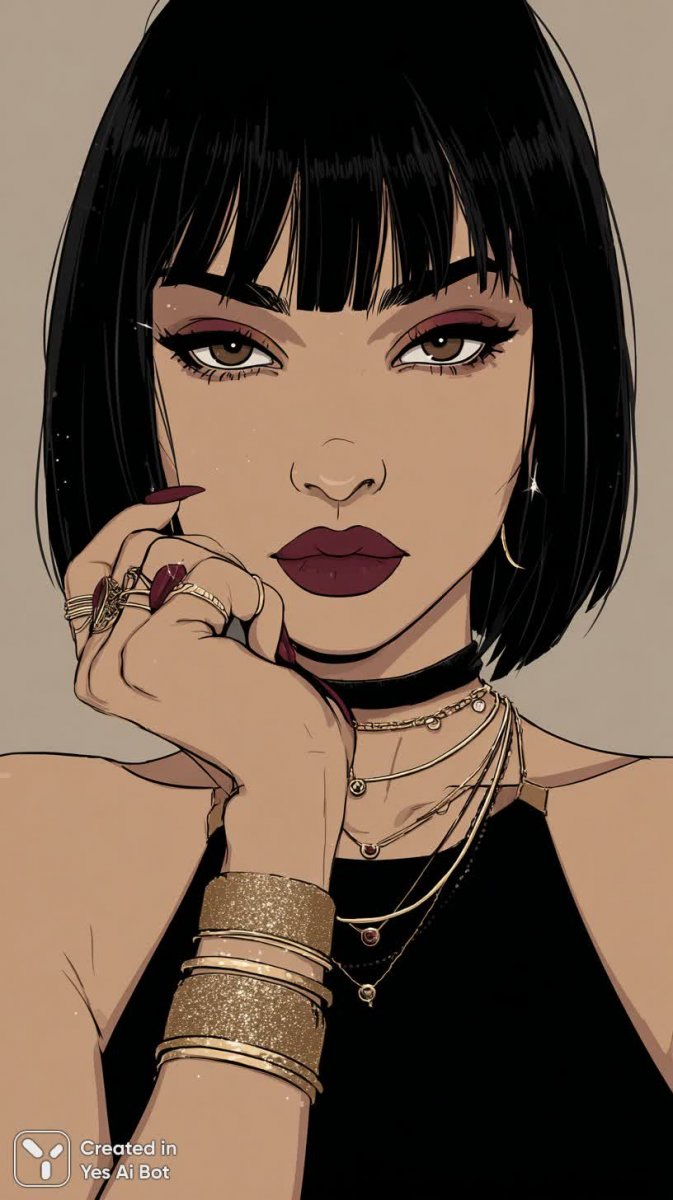 Элегантный портрет молодой женщины, воплощающий в себе дерзкий стиль и безупречный вкус. Длинные черные волосы обрамляют лицо с выразительным макияжем: смелые линии подводки подчеркивают глубину взгляда, а губы окрашены в насыщенный винный оттенок. Акцент на аксессуарах создает образ уверенной и современной личности – массивные золотые кольца и браслеты дополняют многослойные серебряные цепочки, а ногти украшены мерцающими блестками. Высокая детализация позволяет рассмотреть каждую мелочь: текстуру кожи, оттенок помады, игру света на украшениях. Фон в темных глянцевых тонах добавляет драматизма и подчеркивает контрастность образа. Этот портрет – настоящая ода моде и индивидуальности, демонстрирующий гармоничное сочетание классических элементов и трендов современной эпохи. В нем чувствуется сила характера и неповторимый шарм модели, что делает этот снимок запоминающимся и вдохновляющим. Изображение выполнено в формате крупного плана, позволяющем полностью погрузиться в атмосферу стиля и роскоши. Это не просто фотография – это заявление о себе, отражающее уверенность и любовь к прекрасному