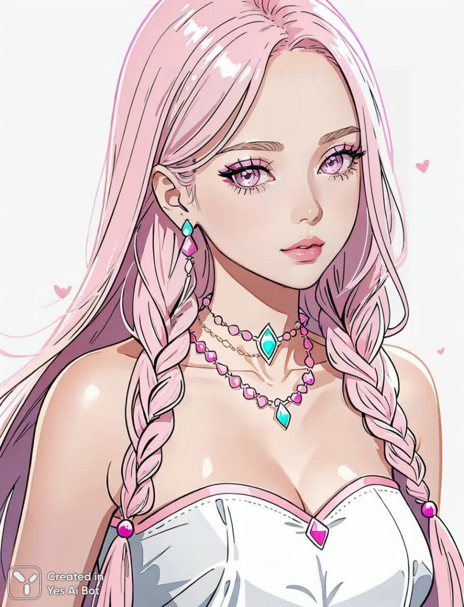 young woman with long pink braids, glossy lips covered in rhinestones, layered pearl necklaces, pink nails with gems, dramatic eye makeup, soft pink lighting, k-pop style, studio shoot, close-up.