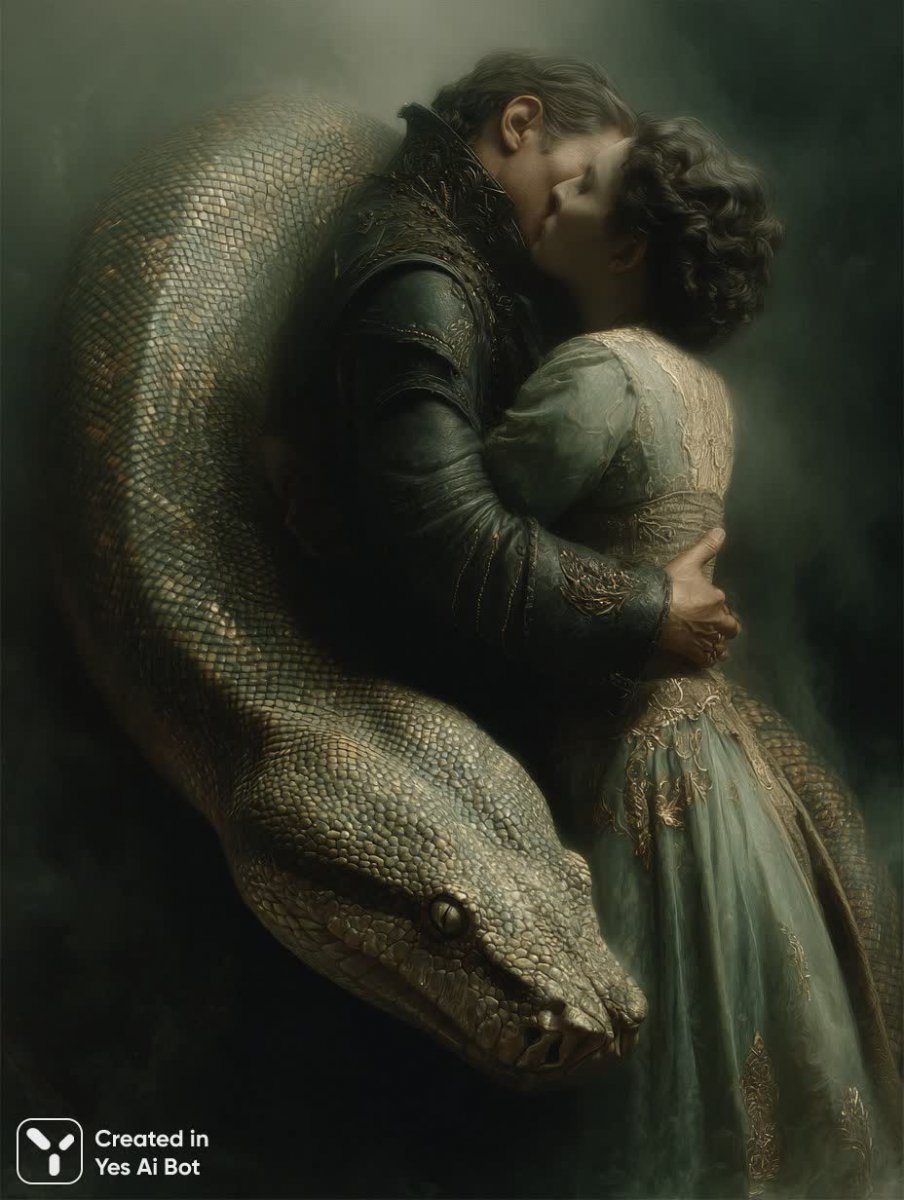 В объятиях тьмы и страсти разворачивается сцена запретной близости. Могучий вампир, с мускулами, напряженными под кожей, и острыми, как бритва когтями, склоняется над беззащитной женщиной, его лицо прижато к ее шее. Её тело изгибается дугой отчаянного сопротивления или неконтролируемого желания – невозможно сказать наверняка, скрытое под покровом темных волос. Она стоит на огромном питоне, чья чешуя переливается всеми оттенками зеленого и желтого, словно живой щит, одновременно прекрасный и опасный. Фон окутан мрачной дымкой, сквозь которую пробивается тусклый отблеск сюрреалистического радужного света, добавляющий картине потусторонний, мистический колорит. Яркое освещение создает глубокие тени, подчеркивая контуры фигур и придавая им рельефность. Текстуры поражают своей детализацией: гладкая кожа женщины контрастирует с грубой чешуей змеи, а таинственная сила вампира ощущается в каждой линии его тела. Все это создает атмосферу темной чувственности и древней мифологии, выполненную в гиперреалистичном стиле, напоминающем работы Бориса Вальехо. Здесь переплетаются элементы фэнтези и эротики, создавая завораживающий образ, полный загадок и скрытых смыслов. Картина пробуждает одновременно страх и восхищение, погружая зрителя в мир темных фантазий и запретных желаний