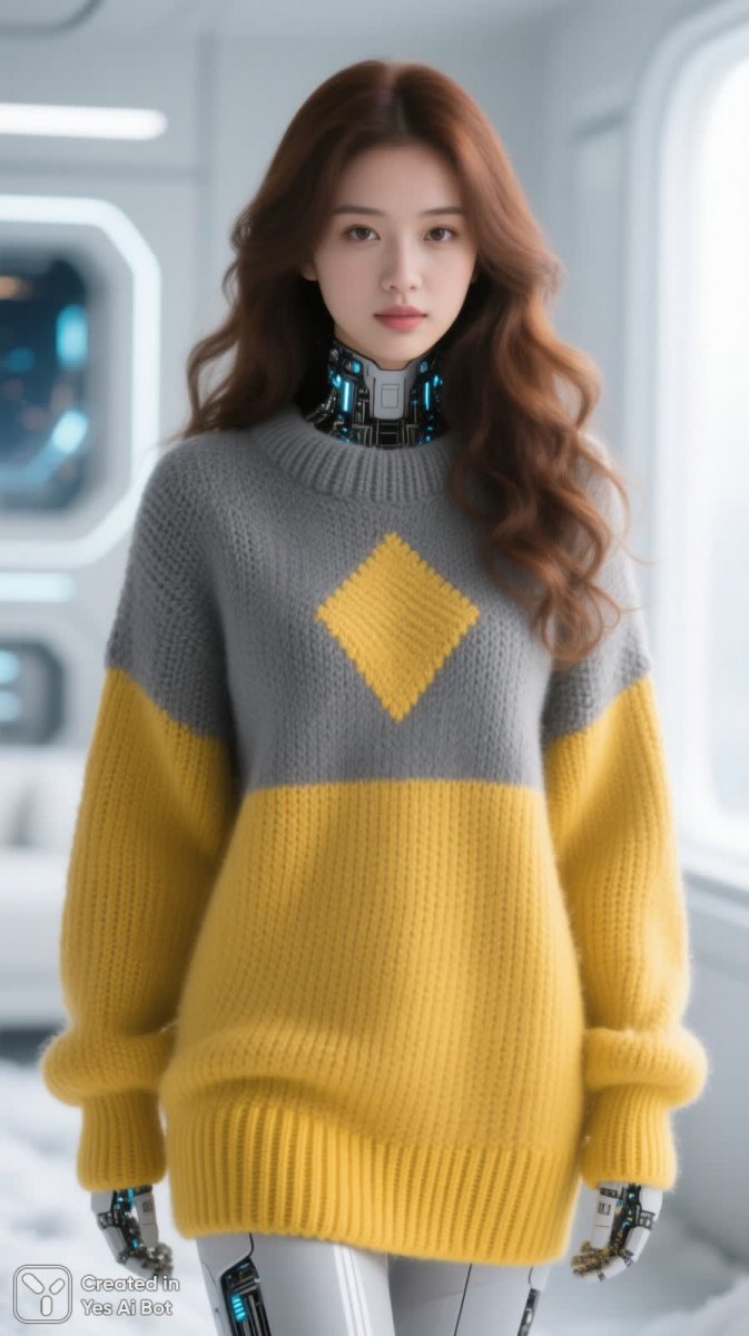 young woman with long wavy chestnut hair, neutral facial expression, wearing chunky knit sweater gray and yellow, upper part features large gray knit with diamond pattern, lower part in bright yellow with wide ribbing on sleeves and hem, sweater appears warm and cozy, feminine style, winter, BG light blurred room, soft daylight.