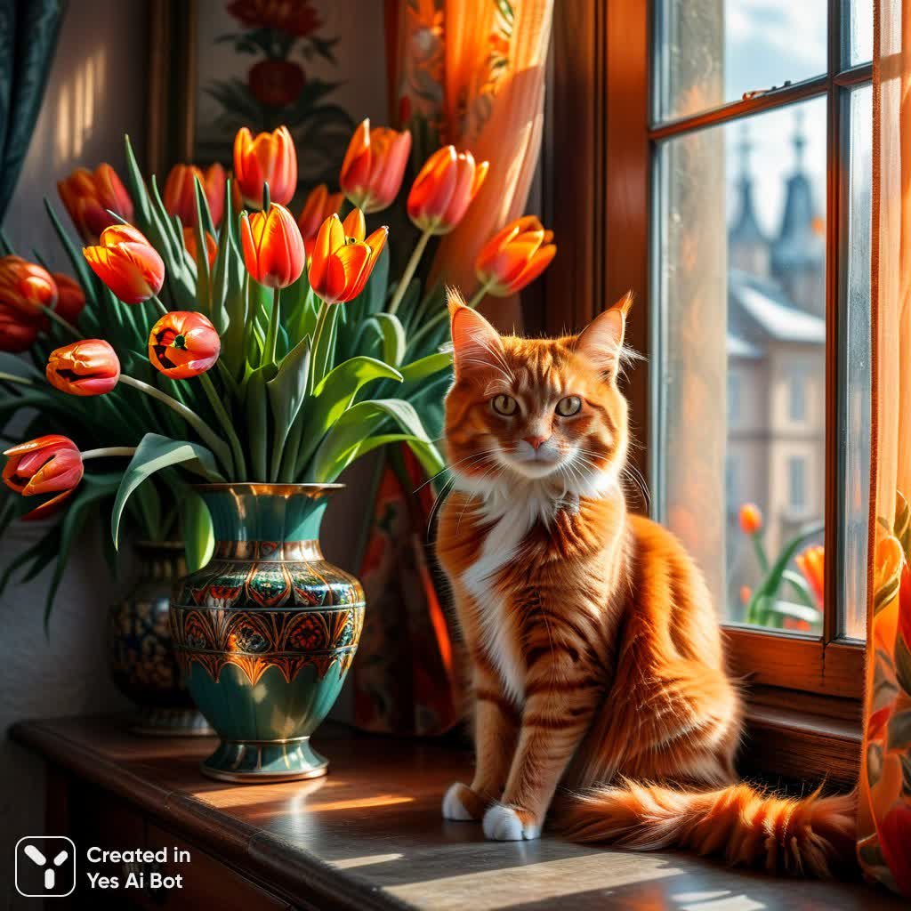 Теплое весеннее утро наполняет пространство светом и нежностью. Рыжий котик с пушистой шерсткой уютно расположился рядом с букетом ярких оранжевых тюльпанов в старинной винтажной вазе, словно сошедшей со страниц истории. Солнечные лучи ласково касаются его мордочки и играют на стенах комнаты, проникая сквозь легкие шторы. За окном расстилается городской пейзаж, окутанный свежестью весеннего дня. Вся картина выполнена в нежной акварельной технике с добавлением мягких пастельных оттенков, создавая ощущение воздушности и легкости. Изображение пронизано атмосферой домашнего уюта и безмятежности, напоминая о тепле родного очага и радости простых моментов. Видна тонкая работа над деталями, передающая текстуру шерсти котика, хрупкость тюльпанов и глубину цвета. Стиль произведения напоминает работы известных художников Тани Хазовой и Александра Стародубова, сочетая в себе реализм и лиричность, нежность и живость. Картина дарит ощущение спокойствия и гармонии, погружая зрителя в мир мечтаний и воспоминаний о весеннем солнечном дне. Эта работа — настоящий гимн красоте природы и домашнему очарованию, воплощенный в мягких тонах и изящных линиях. Изображение вызывает чувство умиления и тепла, словно приглашая заглянуть в мир, где царит любовь и гармония с окружающим миром
