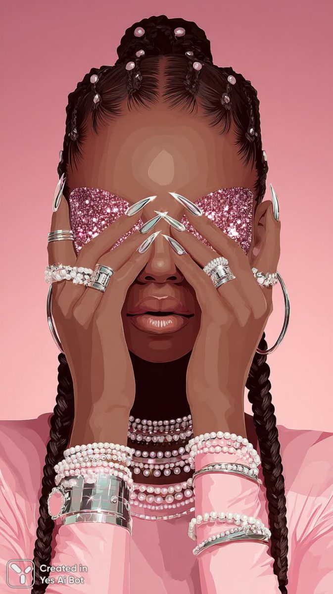 Яркий портрет эффектной африканской красавицы, воплощающей дерзкую гламурную эстетику. Ее темная кожа служит идеальным фоном для драматичного макияжа в насыщенных розовых тонах, акцентированного мерцающим блеском. Длинные косы украшены игривыми блестками, жемчугом и перламутром, создавая ощущение роскоши и праздника. На шее красуется многослойное ожерелье из жемчуга и кристаллов, подчеркивающее индивидуальность и смелый вкус. Дополняют образ длинные ногти, покрытые хромом и сверкающие стразами, а также массивные серебряные кольца в стиле гранж, придающие образу бунтарский оттенок. Нежный неоновый розовый свет окутывает лицо, создавая сияющий ореол вокруг губ, которые выглядят пухлыми и соблазнительными. Фон представляет собой абстрактную темноту, позволяющую полностью сосредоточиться на модели и ее ярком образе. Студийное освещение подчеркивает каждую деталь, делая фотографию невероятно четкой и детализированной в формате ультра hd. Это настоящий манифест гламура, смелости и самовыражения, демонстрирующий силу женской красоты во всей ее многогранности. Фотография излучает уверенность, стиль и неповторимый шарм