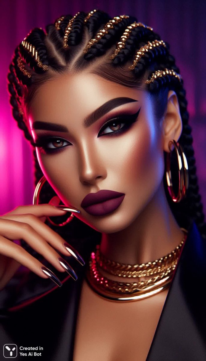 female face close-up, bold eyeliner, gold hoop earrings, braided black hair with pearls, heavy gold necklace, black leather jacket, matte deep wine lips, shiny chrome long nails, macroportrait beauty, neon pink-purple lighting, abstract glowing BG, premium glamour.