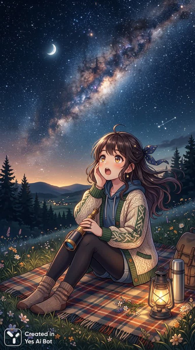 Девушка, укрывшись мягким пледом под бескрайним звездным небом, завороженно смотрит в телескоп. Ее глаза полны искреннего изумления, отражая мерцание далеких светил. Тихая ночь окутывает ее теплом и спокойствием, а легкий ветерок ласково треплет волосы. Она делится своими мечтами с ночным воздухом, ощущая волшебную связь с окружающим миром. Атмосфера уюта и безмятежности царит вокруг, словно время остановилось в этом моменте единения с природой. Звезды сияют над ней, будто подтверждая сказочную реальность происходящего. Мягкие шепоты любви и нежности наполняют пространство, создавая ощущение абсолютного счастья и умиротворения. Эта сцена – воплощение романтики и волшебства, где каждая деталь пронизана чувством гармонии и внутренней красоты. Девушка полностью поглощена моментом, забыв обо всем на свете, наслаждаясь тишиной и великолепием ночного пейзажа. Она окружена зеленью деревьев и растений, что усиливает ощущение единения с природой и создает атмосферу сказочной таинственности. Это момент абсолютного счастья, когда душа наполняется вдохновением и любовью к миру вокруг
