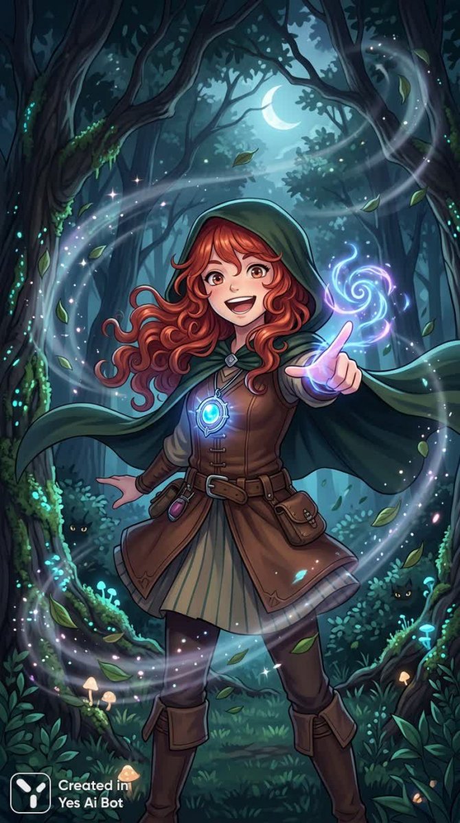 1girl, (рыжая колдунья) 🔮🍂, (в ночном лесу) 🌙🌲, (порыв ветра) 💨🌪️, (светящийся амулет) ✨🔮, (таинственные шорохи) 🌒, (использует магию) 🌌🌟, (игривое выражение) :D, (приключения ждут) 🚀🌟, (погружение в волшебство) 🧙♀️💖.
