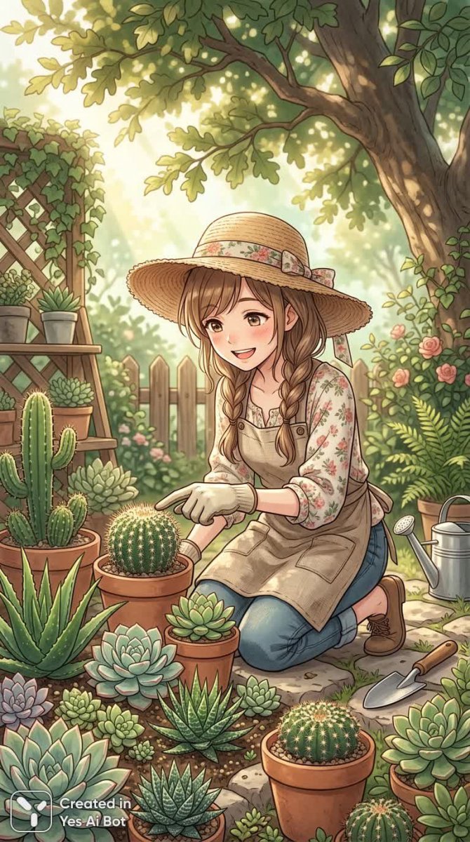 1girl, (tending to a garden) 🌱🌻, (variety of succulents and cacti) 🌵✨, (wearing a straw hat) 👒🌞, (focused expression) 😊🎵, (soft sunlight filtering through leaves) 🌤️🌿, (creating a cozy vibe) 🏡💖, (playfully touching a cactus) :p🌵, (feeling connected to nature) 🌍💚, (expression of happiness) ^_^🌼, (nurturing her green friends) 💖🌱.