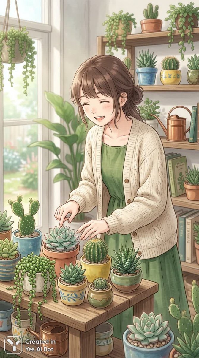 Изображение демонстрирует девушку в ярком и уютном интерьере, окруженную множеством кактусов и других растений в разноцветных горшках. Она нежно касается листьев, выражая спокойствие, восхищение и глубокую любовь к миру суккулентов. Атмосфера пронизана ощущением вдохновения, которое девушка черпает из близости к природе. На ее лице играет улыбка, а легкий смех добавляет тепла и радости сцене, подчеркивая гармонию между человеком и природой. Это визуальное воплощение момента умиротворения и восхищения красотой окружающего мира, создающего ощущение личного зеленого оазиса – пространства, наполненного светом, позитивными эмоциями и стремлением к гармонии с природой. Работа выполнена нейросетью Nano Banana в стиле аниме и иллюстрации, что добавляет ей особую выразительность и детализацию. В целом, изображение передаёт ощущение заботы о растениях и радости от создания собственного уголка природы внутри дома.