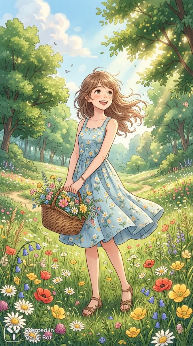 1girl, (holding a basket of flowers) 🌸🌼, (smiling brightly) :D, (wearing a sundress) 👗✨, (standing in a vibrant meadow) 🌼🌞, (flowers blooming around her) 🌷🌺, (sunlight filtering through trees) 🌳✨, (feeling joyful and free) ^_^, (gentle wind in her hair) 🍃💖, (capturing the essence of spring) 🌼🌸, (warm and cheerful atmosphere) ☀️🥰.