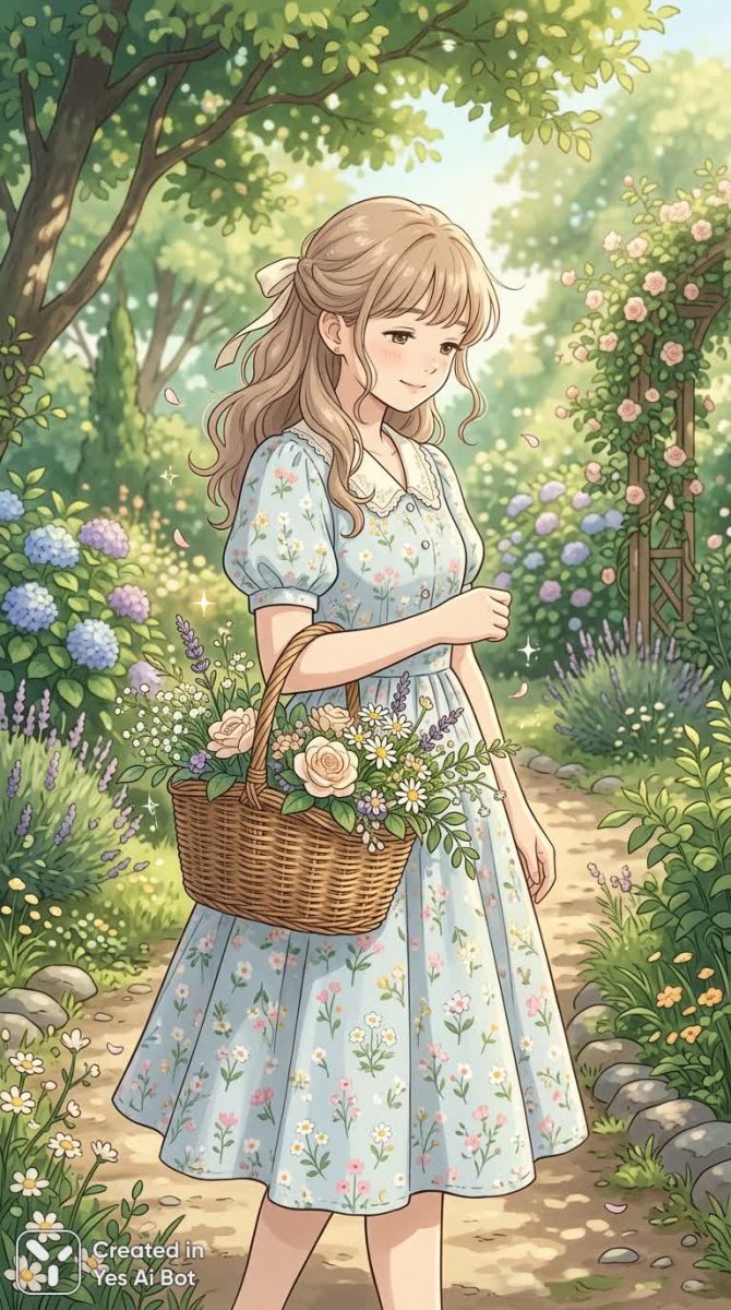В этом чудесном изображении запечатлена юная девушка, словно сошедшая со страниц сказочной книги. Она несет корзину, доверху наполненную свежими, благоухающими цветами – розами, ромашками, подсолнухами и множеством других прекрасных оттенков. На ее лице играет милая, сладостная улыбка, излучающая искреннюю радость и счастье. Окруженная пышной зеленью сада, она кажется частью этого цветущего мира. Воздух вокруг наполнен тонким ароматом раскрывающихся бутонов – это настоящее воплощение весны и обновления. В ее сердце царит безмятежность и позитивные мысли, что отражается в легком и счастливом выражении лица. Девушка одета в очаровательное платье с цветочным принтом, которое подчеркивает ее нежную красоту и гармонию с окружающей природой. Она ощущает тепло солнечных лучей, ласково согревающих ее кожу, и наслаждается каждым мгновением этого чудесного дня. Вся композиция пронизана атмосферой элегантности, красоты и безграничного счастья. Это изображение – ода красоте природы и женственности, воплощенная в одном прекрасном моменте. Оно дарит ощущение тепла, уюта и вдохновения, напоминая о простых радостях жизни и важности ценить каждый момент. Кажется, что время замерло, чтобы сохранить эту неповторимую картину, полную света, красок и позитивных эмоций