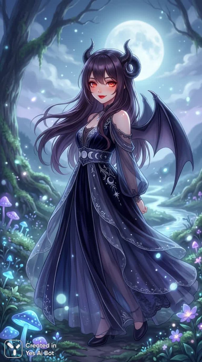 Очаровательная суккуб в волшебном пейзаже пленяет взгляд своим загадочным образом. В ее огненно-красных глазах горит искра соблазна, а чувственные красные губы манят к тайне. Мягкий лунный свет окутывает ее, подчеркивая неземную красоту и окружает мерцающим сиянием, словно сотканным из снов. Она облачена в струящееся черное платье, которое легко колышется на ветру, играя с мягкими прядями волос. Ее игривое выражение лица намекает на скрытые чары и пленит воображение. Вокруг нее разливается волшебная аура, создавая атмосферу мистики и притяжения. Пейзаж вокруг словно дышит тайной, а вода вдали отражает небесные светила. Каждая деталь создает незабываемый момент, наполненный завораживающей сущностью и необъяснимым магнетизмом. Она излучает притягательную силу, способную покорить любое сердце и увлечь в мир фантазий и грез. Это не просто изображение – это воплощение соблазна, магии и неуловимой красоты, запечатленное в мгновении вечности. Ее пленительное очарование невозможно забыть, а взгляд, полный обещаний, остается в памяти навсегда. Она словно сошла с полотен великих художников, чтобы подарить миру свою неповторимую красоту и притягательность