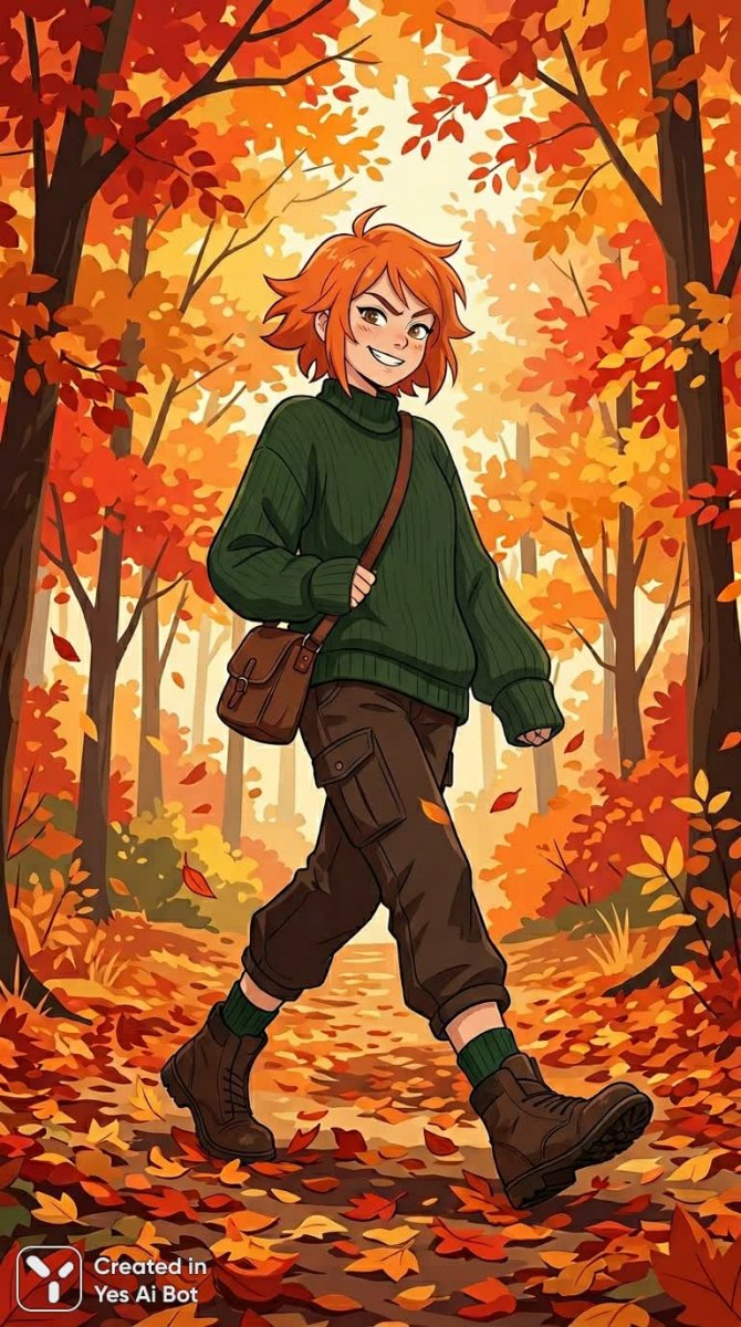 Молодая девушка в ярком апельсиновом бобе с короткими ежиками уверенно шагает сквозь багряный осенний лес. Вокруг бушует красота увядающей природы – огненные листья кружатся в воздухе, создавая ощущение настоящего пожара красок. Она одета в уютный джемпер с рукавами, частично скрывающими руки, словно погружена в состояние комфорта и спокойствия. На ее лице застыло выражение озорства и легкой хитрости, взгляд полон решимости и азарта. Ноги обуты в прочные походные ботинки, а на ногах – теплые охотничье-зеленые носки, готовые к любым приключениям. В ее глазах читается целый спектр эмоций – любопытство исследователя, жажда открытий и непоколебимая уверенность в себе. Кажется, она преодолела нелегкий путь и теперь триумфально движется вперед, наслаждаясь каждым шагом по шуршащей листве. Ее образ излучает энергию, смелость и готовность к новым вызовам, сочетая в себе наивную непосредственность и внутреннюю силу. Это портрет молодой женщины, полной жизни и жаждущей приключений, которая не боится идти своим путем и покорять новые вершины. Она – воплощение уверенности, оптимизма и неукротимой воли к победе в мире ярких красок и захватывающих дух пейзажей