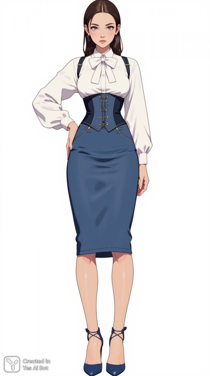 ultra-detailed illustration, tall girl, white bow blouse paired with decorative denim corset, blue high-waisted fitted midi skirt, sharp facial features, brown slicked back hair, bare skin tone, blue lace-up stiletto sandal heels, stand hand leaning on thigh, confident offspring look, light shadows, hyper realistic, 4k quality, blank white background.