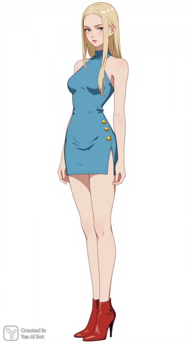 Изящная модель с длинными ногами запечатлена в ультравысоком разрешении, демонстрируя безупречное качество изображения. Ее гладкие, прямые светлые волосы собраны назад, акцентируя внимание на изысканном силуэте. Это скорее модный иллюстративный снимок, чем фотография, передающий дух современной моды. На ней надето облегающее мини-платье с бретелями синего цвета, украшенное золотыми пуговицами, и юбка с боковым разрезом, добавляющая образу динамики и элегантности. Яркие красные туфли-лодочки на высоком каблуке завершают ансамбль, подчеркивая уверенность и стиль. Взгляд модели выражает легкую скуку или отстраненность, создавая интригующую атмосферу. Фон – однотонный белый, что позволяет полностью сосредоточиться на фигуре и деталях одежды. Мягкое студийное освещение деликатно подчеркивает текстуры и оттенки, добавляя глубины изображению. Камера расположена на уровне пола, обеспечивая уникальный ракурс и усиливающий эффект присутствия. Вся композиция выдержана в современном издательском стиле, идеально подходящем для глянцевых журналов и модных каталогов. Это визуальное воплощение элегантности, изысканности и современной моды, выполненное с безупречным вниманием к деталям и эстетике. Стиль работы напоминает о лучших образцах иллюстративного искусства в мире моды, сочетая реализм и художественную выразительность