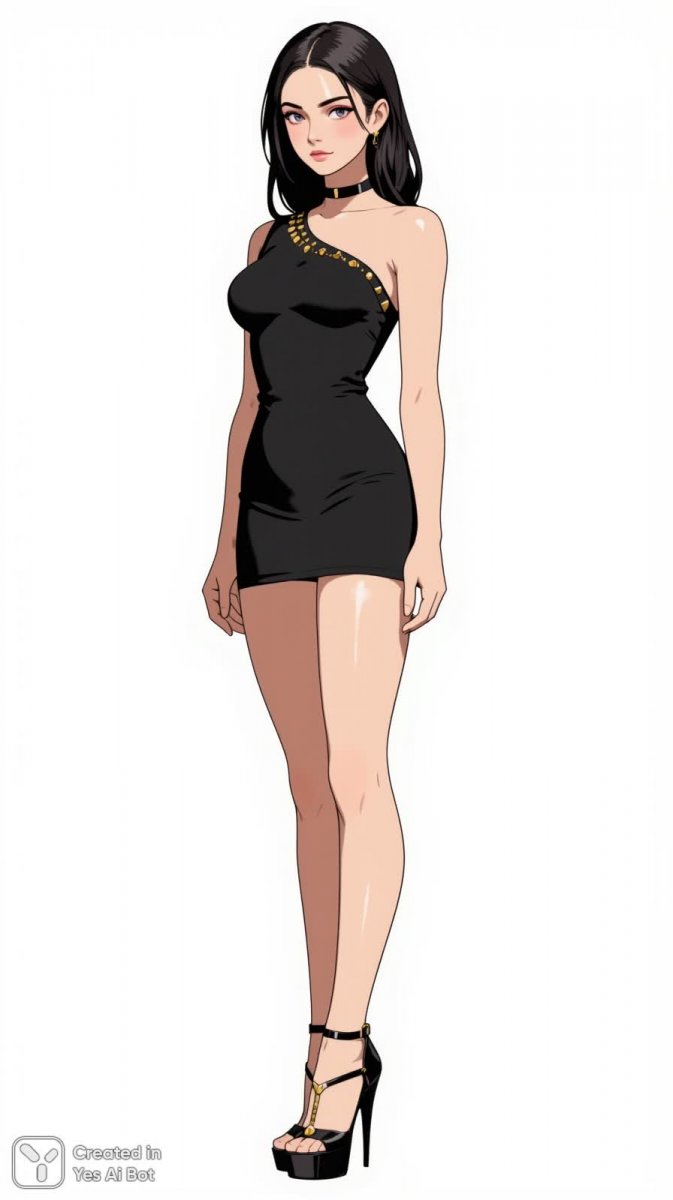 Элегантная и утонченная цифровая иллюстрация демонстрирует изящную фигуру в стильном минималистичном образе. Модель с длинными стройными ногами предстает в облегающем черном боди на одно плечо, украшенном золотыми заклепками – деталью, добавляющей образу дерзости и роскоши. Мини-юбка из кристаллов подчеркивает грацию силуэта, а высокие черные сандалии-гладиаторы на шпильке завершают ансамбль, придавая ему эффектности и динамичности. Тонкие темные волны, уложенные с бокового пробора, гармонично сочетаются с деликатным макияжем, выражающим сдержанность и дисциплину. Фигура изображена под изометрическим углом, что обеспечивает динамичный обзор модели и позволяет рассмотреть все детали ее наряда. Иллюстрация выполнена в высоком разрешении, с использованием мягкого равномерного студийного освещения, создающего ощущение воздушности и чистоты. Фон – идеально белый, акцентирующий внимание на красоте и изяществе представленной фигуры, а также подчеркивающий минимализм и современность стиля. Это визуальное воплощение элегантности и уверенности в себе, сочетающее в себе классические элементы моды с современными тенденциями цифрового искусства. Композиция создает ощущение легкости, грации и безупречного вкуса