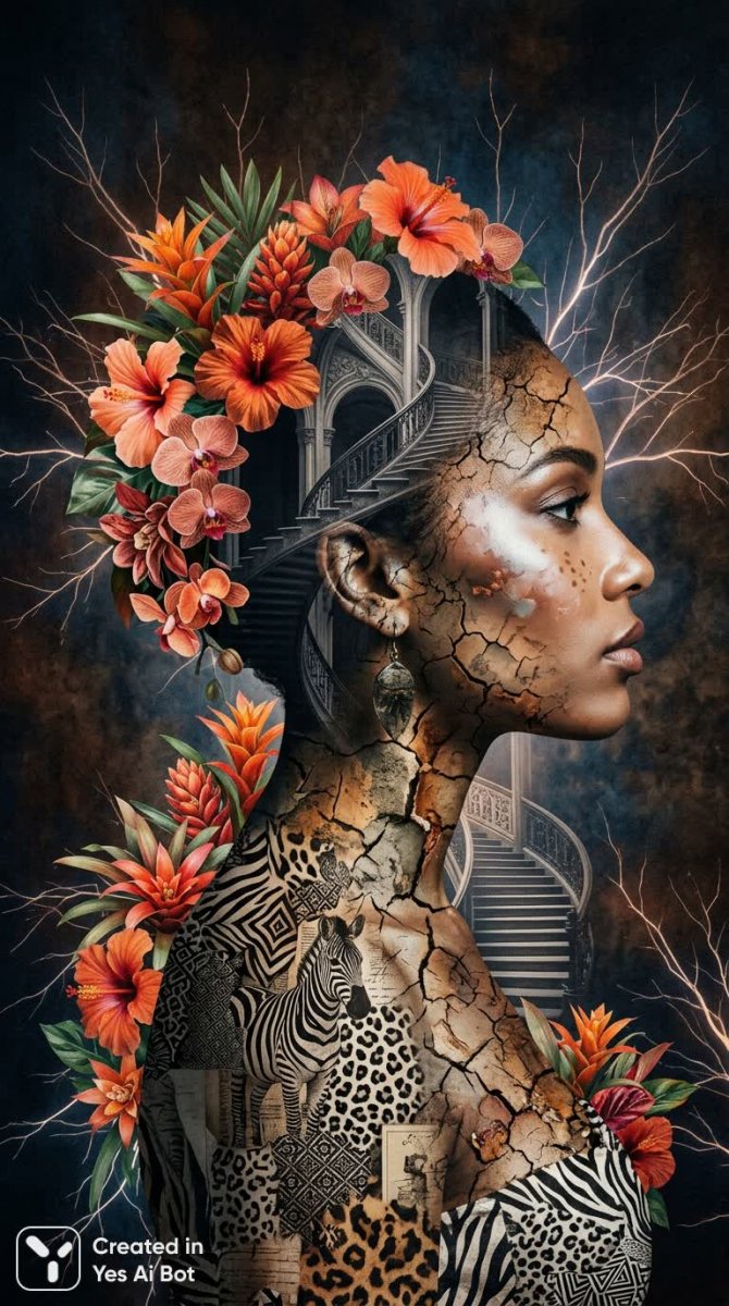 Женщина в профиль предстает на фоне потрескавшейся земли, отмеченной шрамами, символизирующими стойкость и жизненный опыт. Ее лицо украшено коллажем черно-белых изображений животных, переходящих в яркие оранжевые и красные тропические цветы, создавая контраст между дикой природой и нежной красотой. Над композицией наложена прозрачная лестница, добавляющая ощущение загадочности и многослойности. Кожа модели выполнена с фотореалистичной детализацией, излучая мягкое свечение благодаря деликатным оттенкам, подчеркивающим ее утонченность. По краям изображения пульсируют тонкие ветви деревьев, создавая динамичный эффект и усиливая сюрреалистическую атмосферу произведения. Это двойная экспозиция высокой четкости воспевает хрупкость и способность к возрождению, сочетая в себе элементы природы, животного мира и человеческой фигуры для создания визуальной метафоры о внутренней силе и уязвимости. Картина акцентирует красоту несовершенства и напоминает о возможности находить вдохновение даже в сложных обстоятельствах, отражая глубокое размышление о связи человека с окружающим миром через безупречное художественное исполнение, сгенерированное нейросетью Nano Banana v.2.0 при помощи Yes Ai Bot.