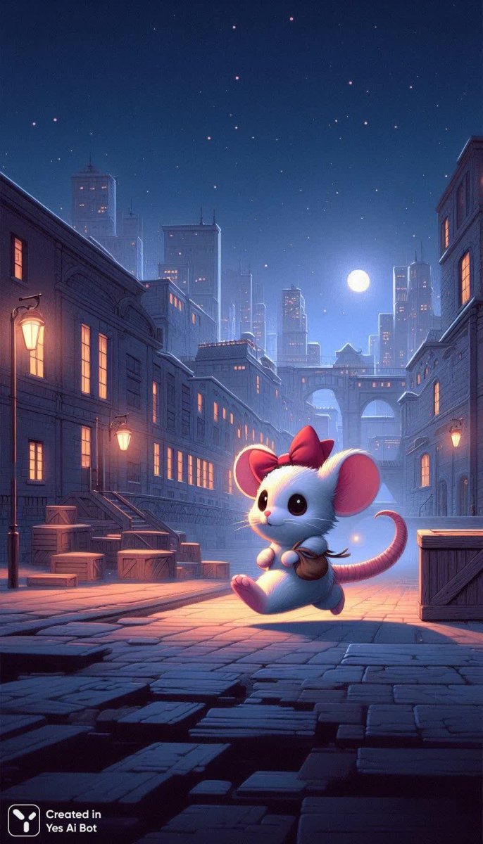 Завораживающая иллюстрация в стиле мультфильма представляет собой очаровательного крысенка с белоснежной шерсткой и алой бантиком на голове. Он мчится наперегонки по безлюдному индустриальному району огромного города, погруженного во тьму ночи. Взгляд крысенка обращен назад – он обеспокоенно оглядывается через плечо, неся на шее сумку, а его хвостик развевается в потоке ветра. За ним простирается мрачный пейзаж индустриальной зоны пустого мегаполиса, освещенного лишь тусклым светом уличных фонарей и отражениями в темных окнах зданий. Детализированный рисунок передает невероятную динамику сцены, создавая ощущение стремительного движения и легкой тревоги. Изображение пронизано атмосферой таинственности и приключения, заставляя зрителя задуматься о том, что же скрывается в сумке у крысенка и куда он так спешит в этом безмолвном городе. Контраст между нежностью персонажа и суровостью окружающей среды добавляет картине глубины и эмоциональной насыщенности. Это яркий пример мастерского владения техниками мультипликационной графики, способный вызвать улыбку и пробудить воображение любого зрителя, ценящего красоту деталей и оригинальность сюжета. Ощущение ночного города подчеркивается темным фоном и акцентом на освещенных элементах индустриального ландшафта