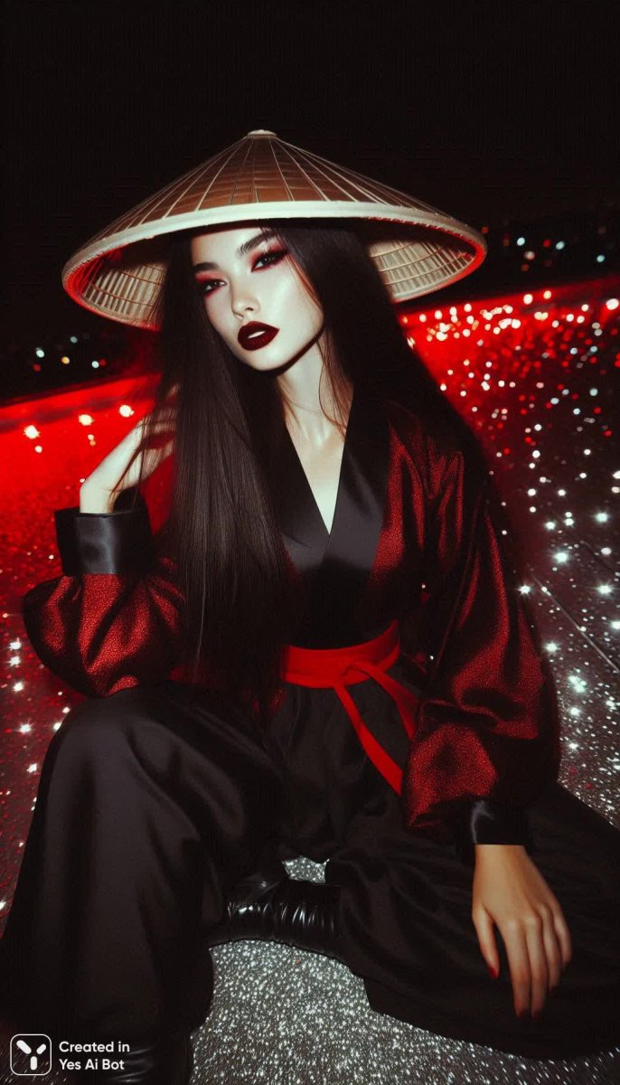 Красно - черное бархатное фото на пленку, просроченный снимок. Ночь не в фокусе, эффект фотовспышка. помехи, царапины на фото, опаловое белое свечение, живое фото, бархат, шолк. Фото с ярко красно-белым акцентом. поза в движение. Вид сверху вниз. Сидит на металлической сверкающей крыше Высока очень красивая fitnes милая девушка длинные черные прямые распущенные волосы, на голове конической шляпа самурая, темные бордовые пушистый губы, рука за головой в движении позирует, одета в костюм в стиле самурая состоит из черной блузы с длинными рукавами, красно белые ремни клепки, в широких брюках, ботинки платформы шнуровка, поза в движение, готично,...