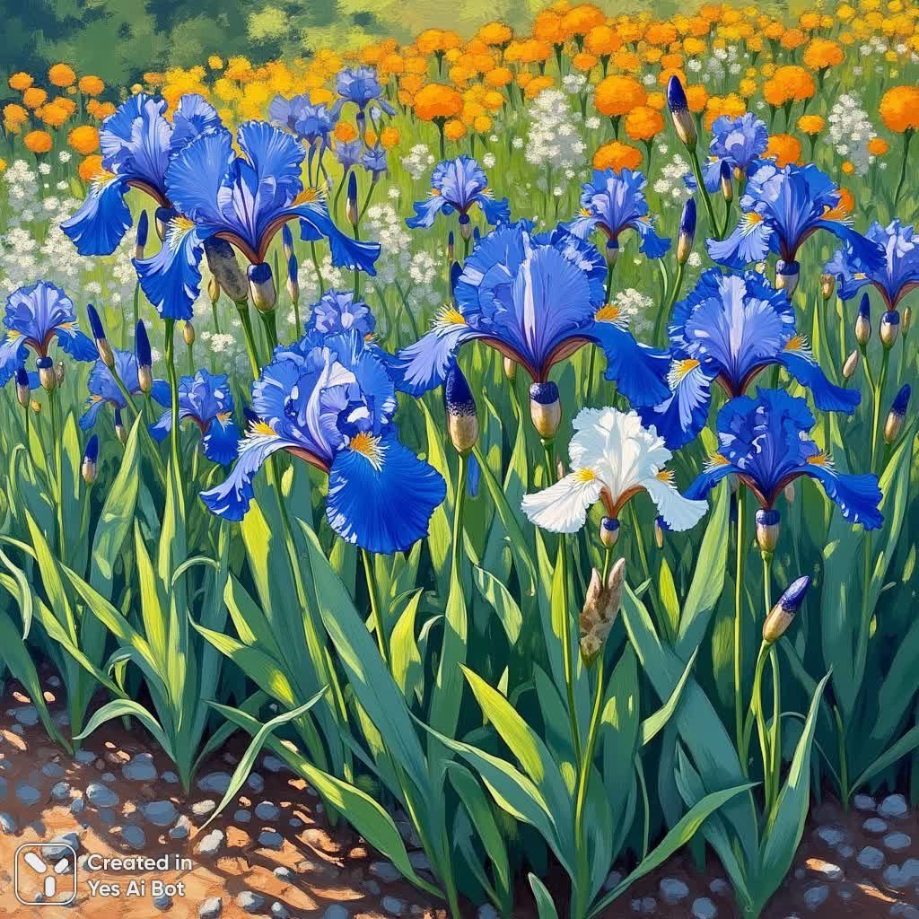 Яркий сад утопает в синих ирисах, каждый лепесток которых написан насыщенными мазками индиго и фиолетового. Среди них выделяется одинокий белый ирис, добавляющий контраста этой цветовой палитре. Пышные вытянутые зеленые листья создают густой динамичный подлесок, выполненный с энергичными штрихами кисти, словно передающими жизненную силу растений. На заднем плане буйство мелких оранжевых и желтых цветов, вероятно бархатцев, образует живую импрессионистскую мозаику на фоне мягкой зеленой листвы, создавая ощущение глубины и простора. Передний план картины представляет собой текстурированную красно-коричневую землю, добавляющую реалистичности композиции. Светлый солнечный день подчеркнут тонкими цветовыми перепадами теней, которые деликатно играют на поверхности цветов и листьев. Ракурс съемки немного снизу позволяет зрителю полностью погрузиться в эту пышную растительность, акцентируя внимание на органических плавных формах растений и их взаимодействии друг с другом. Атмосфера картины пронизана сияющей природной красотой и мирной энергией, что характерно для стиля постимпрессионизма, где особое значение придается эмоциональному выражению цвета и текстуры. Общее настроение полотна – радостное и живое, наполненное великолепием природы, с использованием узнаваемой техники импасто, которая придает картине объемность и тактильность, позволяя ощутить фактуру каждого лепестка и листа. Это настоящее гимн красоте и изобилию природного мира