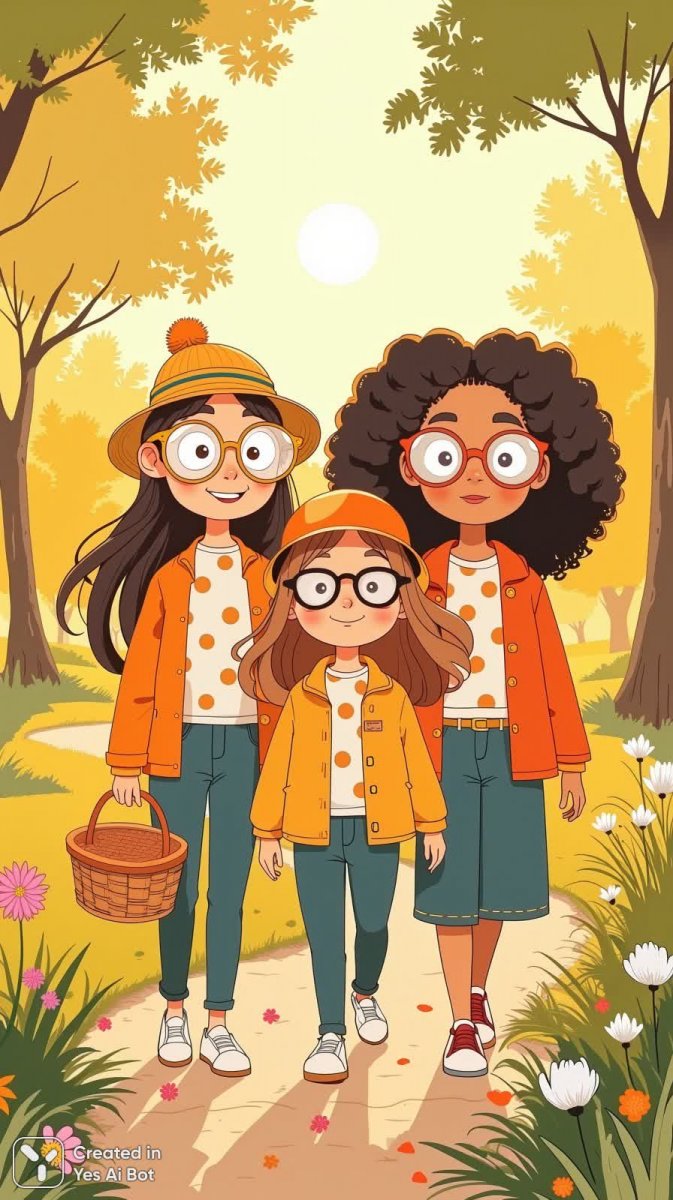 Трое жизнерадостных персонажей в забавных огромных очках и с широкими улыбками отправляются на пикник в солнечный парк. Их яркие многослойные наряды украшены игривыми горошинами, создавая ощущение легкости и беззаботности. В руках у них плетеная корзина для пикника и уютный плед – все необходимое для веселого отдыха на природе. Мягкий золотистый свет заливает сцену, подчеркивая теплую атмосферу и радостное настроение героев. Стиль иллюстрации - милый мультяшный, с акцентом на доброту и позитив, что делает изображение особенно привлекательным и вызывает приятные эмоции. Кажется, будто их ждет незабываемый день полный смеха, вкусной еды и солнечного тепла в окружении зелени парка. Этот образ идеально подходит для оформления детских товаров, иллюстраций к сказкам или просто для поднятия настроения своим ярким и позитивным видом. Вся композиция излучает ощущение счастья и безграничной радости от простых моментов жизни, проведенных в компании близких людей на свежем воздухе. Это визуальное воплощение летнего дня, наполненного весельем и приятными сюрпризами