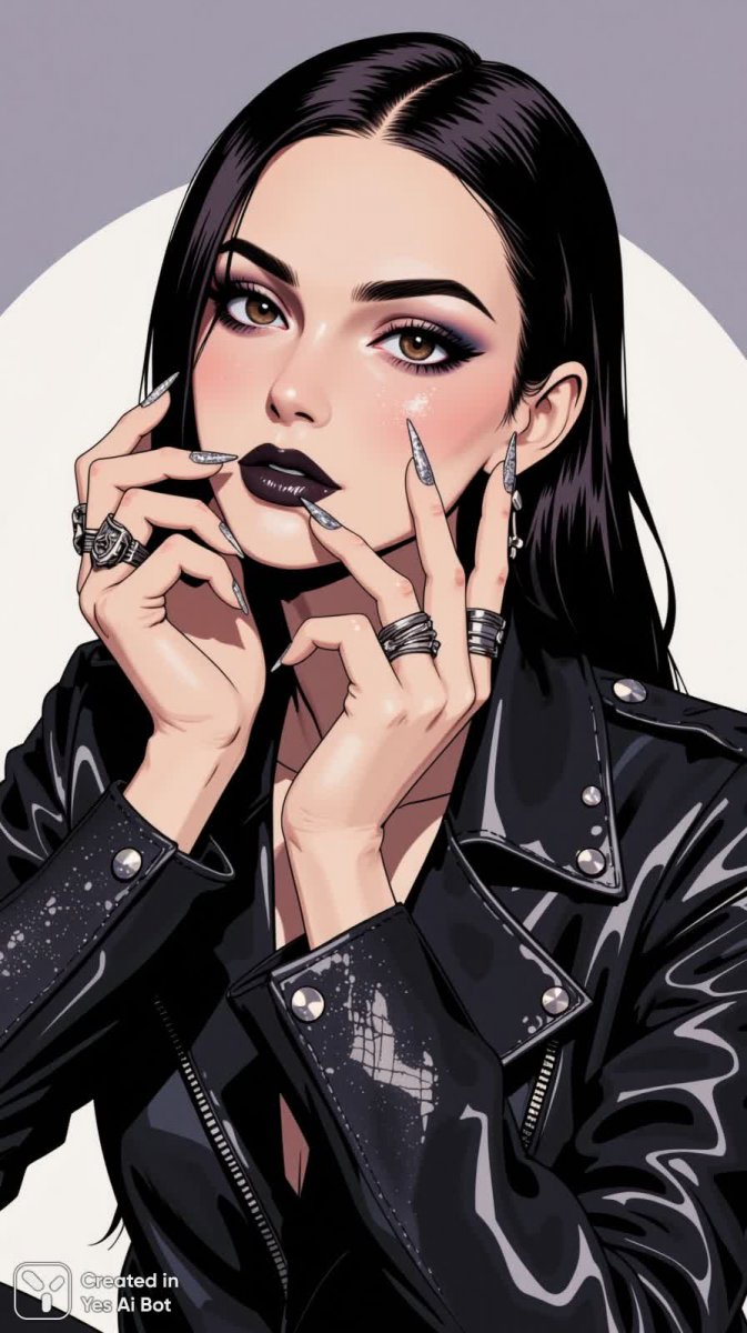 1. dramatic makeup with bold dark eyeliner and shimmering eyeshadow, long sparkling nails, multiple statement rings, textured leather jacket, studio lighting, glamor style, soft-focused BG.