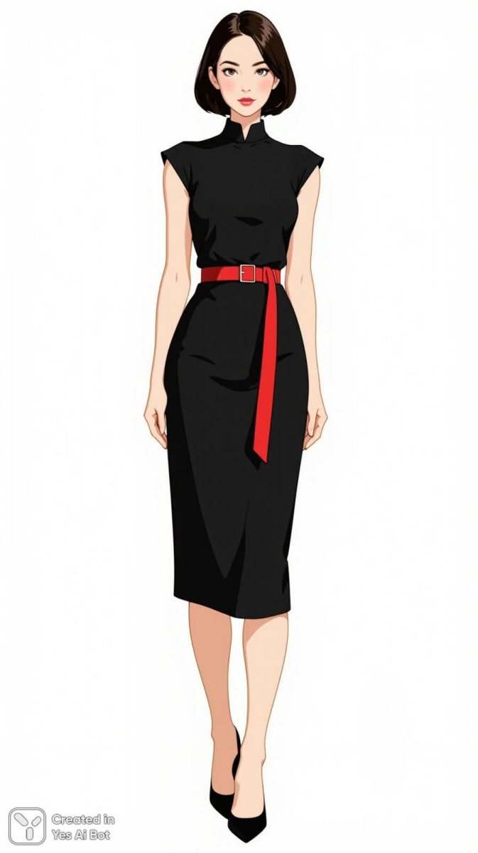5. woman in sophisticated black pencil dress with cap sleeves and high collar, accentuated with a red belt, wearing classic black pumps, hair styled in a sleek bob, BG is white.