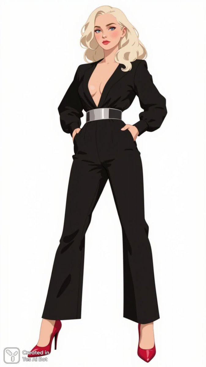 Изящный силуэт женщины в элегантном черном комбинезоне приковывает взгляд своей безупречной простотой и утонченной детализацией. Глубокий V-образный вырез акцентирует линию декольте, а длинные рукава добавляют образу строгости и завершенности. Приталенный крой подчеркивает талию, делая фигуру стройной и грациозной. Серебряный пояс тонкой линией выделяет талию, придавая облику нотку роскоши и гламура. Ярким акцентом в этом ансамбле выступают лаконичные красные туфли-лодочки на шпильке, которые добавляют образу динамики и женственности. Обувь идеально сочетается с темным цветом комбинезона, создавая гармоничный контраст. Волосы женщины уложены в мягкие локоны, придающие образу легкость и воздушность. Прическа выглядит естественно и элегантно, подчеркивая красоту лица. Фоном для этой стильной композиции служит чистый белый цвет, который не отвлекает внимание от главной героини, а наоборот, усиливает ее эффектное присутствие. Вся картинка создает впечатление изысканности, уверенности и безупречного вкуса. Это образ современной женщины, которая знает себе цену и умеет подчеркнуть свою индивидуальность с помощью стильной одежды и аксессуаров. Она выглядит одновременно элегантно и современно, воплощая в себе идеал женской красоты и стиля. Этот образ подойдет для светского мероприятия или деловой встречи, где важен безупречный внешний вид и уверенность в себе