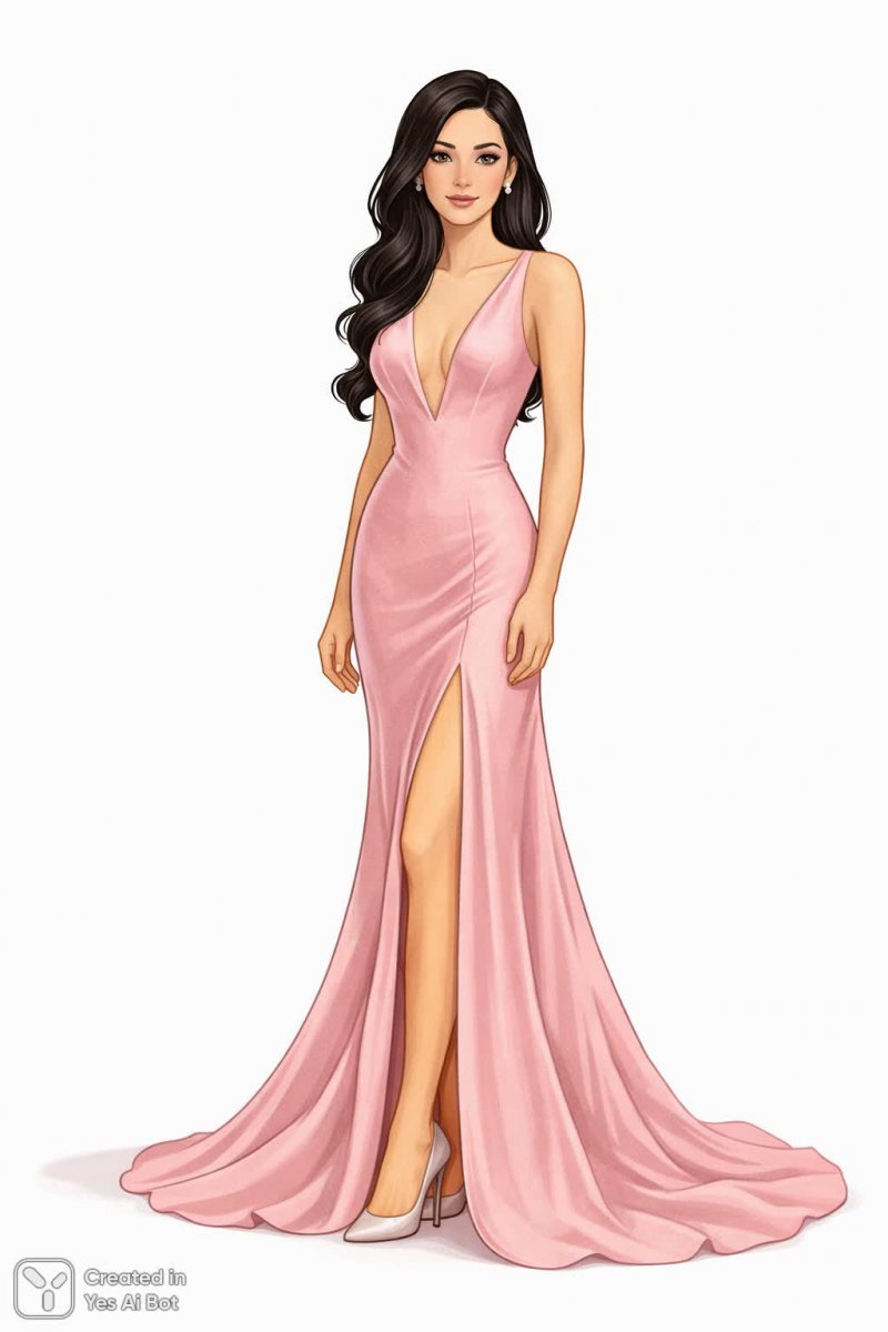 woman wearing long pink evening gown with a plunging neckline, fitted through the waist with a flowing skirt that cascades to the floor, paired with silver stiletto heels, long dark hair styled in loose waves, minimal jewelry, bg is plain white.