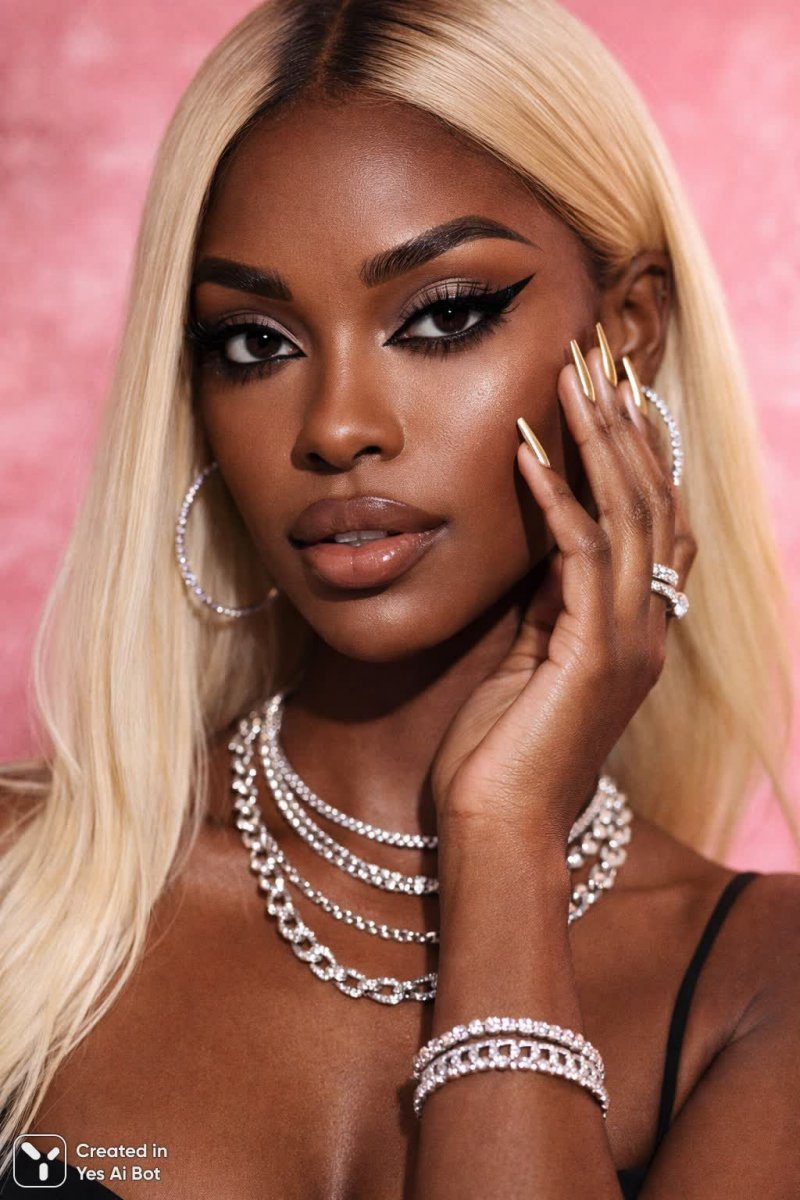 dark-skinned woman with straight blonde hair, bold black eyeliner, dramatic lashes, long golden nails, layered silver jewelry, close-up shot with soft focus, glamour style, studio lighting, abstract pink BG.