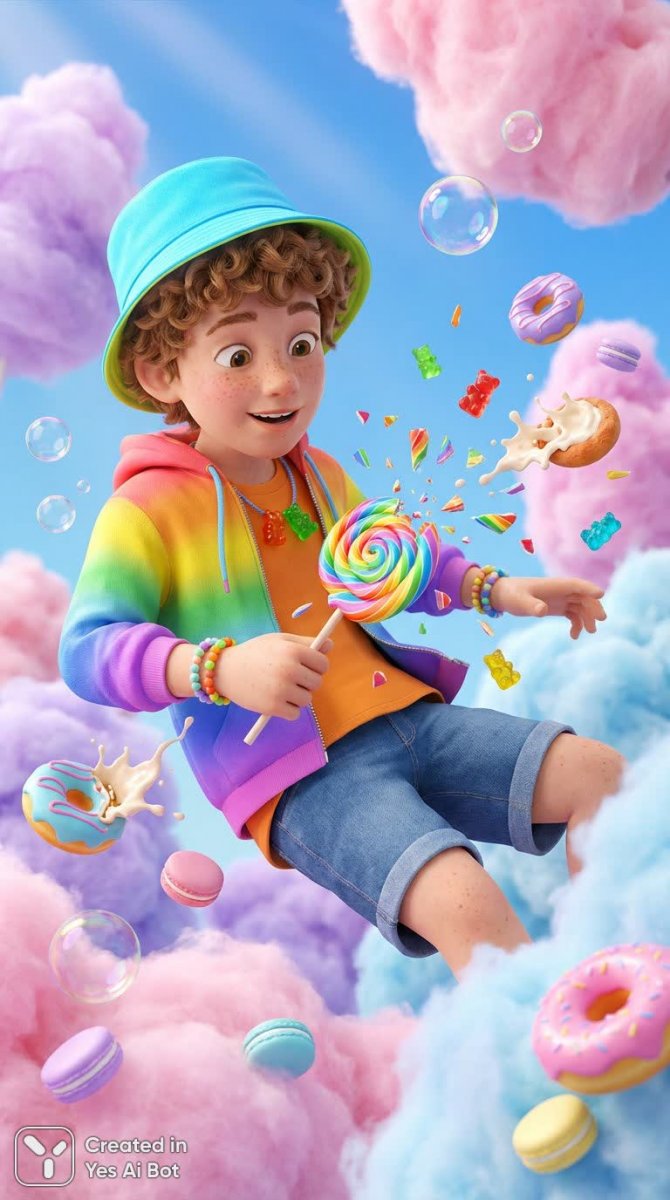 Волшебный мир сладостей оживает в этом невероятном изображении! Мальчик с веснушками, парящий среди нежных облаков из сахарной ваты, словно сошел со страниц сказочной книги. Его непослушные кудрявые волосы обрамляют лицо, а на голове – яркий неоново-голубой ковбойский шляпный гребень. Он одет в забавную радужную толстовку с оранжевой футболкой и высокие джинсовые шорты, украшенные бусинами и ожерельем из мармеладных мишек. В его руке разбивается спиральный леденец всех цветов радуги, рассыпая вокруг себя яркие конфетные осколки. Вокруг мальчика взрываются красочные пончики и пастельные макаруны, разбрызгивая сливочную начинку в воздухе. Прозрачные глянцевые мармеладки кружатся в танце, а мыльные пузыри переливаются всеми цветами радуги. Динамичная широкая композиция захватывает дух и создает ощущение полного погружения в эту фантастическую страну сладостей. Яркое голубое небо с мягкими белыми облаками добавляет общей картине воздушности и легкости. Мягкий объемный свет подчеркивает каждый деталь, а малая глубина резкости фокусирует внимание на главном герое этой сказочной истории. Это ультрареалистичная иллюстрация в формате HD 3D, выполненная в насыщенных пастельных тонах высочайшего качества, вызывающая неподдельное восхищение и желание оказаться внутри этого волшебного мира. Идеально для любителей ярких и необычных визуальных образов!