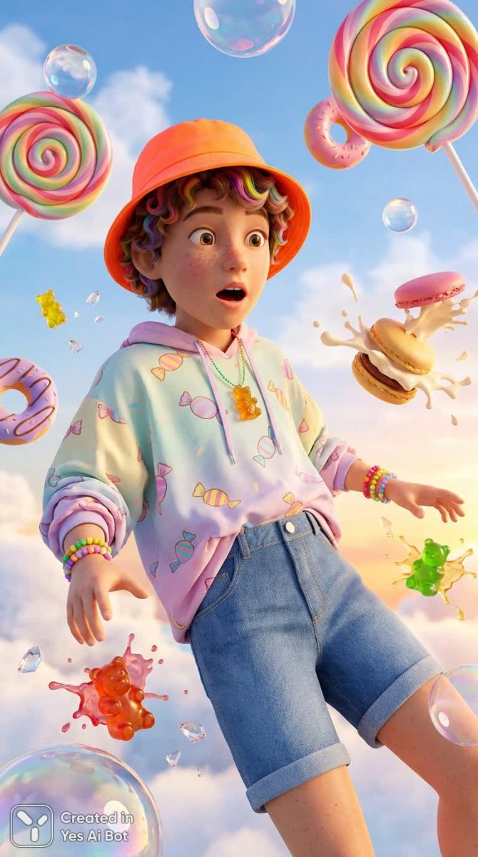 Волшебный мир сладостей оживает в этой невероятной иллюстрации! Юный мальчик с кудрявыми волосами и веснушками парит среди гигантских спиральных леденцов и ярких мультяшных пончиков, словно попав в сказочную кондитерскую. Его волосы переливаются радужными полосками, а на голове – неоновый оранжевый бакет-хэт, дополненный просторной пастельной толстовкой с узором из конфет. Джинсовые шорты с высокой талией и бусы в виде мишек гамми, яркие браслеты из разноцветных бусин, а также блестящие пастельные кроссовки завершают его образ, полный детской непосредственности и радости. Вокруг мальчика словно взрываются макаруны, разлетаясь облаками крема, а вблизи – крупный план ярких мармеладных мишек с брызгами желе. Разлетевшиеся на осколки радужные леденцы и сверкающие сахарные кристаллы создают ощущение волшебства и беззаботности. Мыльные пузыри с переливающимися бликами дрейфуют в солнечном голубом небе, усыпанном мягкими белыми облаками, а нежное закатное освещение гармонично сочетается с мягким дневным светом. Широкоугольная композиция и малая глубина резкости подчеркивают гиперреалистичность этой глянцевой 3D-иллюстрации, выполненной в ярких насыщенных пастельных тонах. Каждая деталь проработана с невероятной тщательностью, создавая атмосферу фантастического мира сладостей, который перенесет вас в самое сердце детства и подарит ощущение сладкой сказки. Это настоящее произведение искусства, воплощающее мечты о мире, где все возможно!