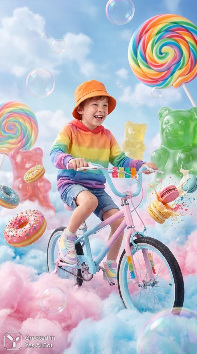 Сладкие грезы: мальчик на велосипеде в сказочном мире конфеток и радуг - Пример изображения, сгенерированного нейросетью Nano Banana