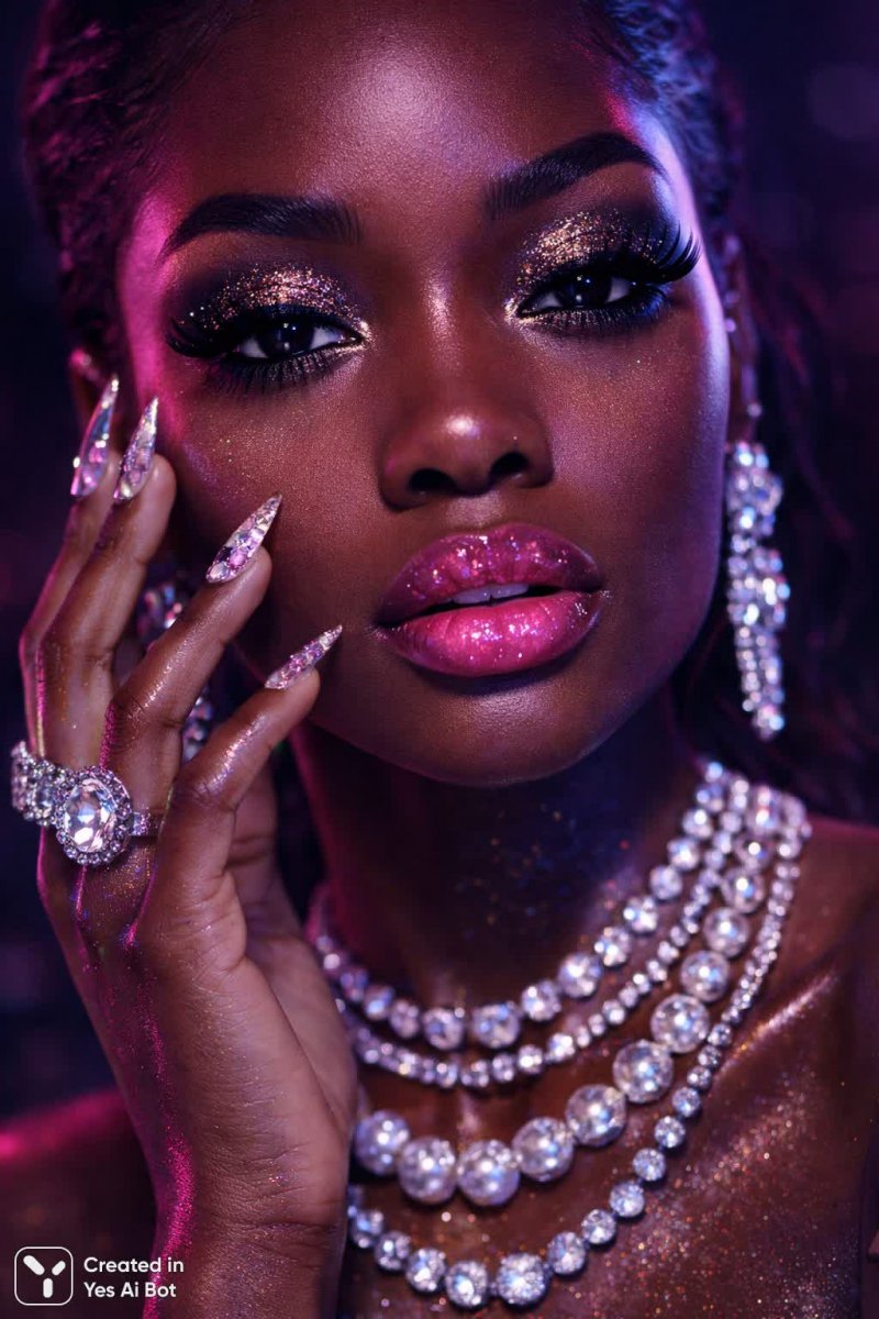 dark-skinned female face close-up, glossy makeup with shiny pink lips, glittery dark eyeshadow with gold accents, bold long false eyelashes, long chrome finish nails with pink gems, layered pearl and crystal necklaces, rings with large rhinestones, cyber-glam style, neon pink-purple lighting, bg dark blurred, studio photography, high detail, premium quality