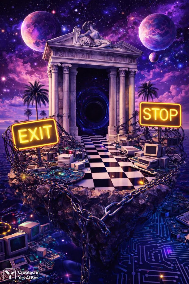 Завораживающая сюрреалистичная композиция сочетает в себе руины мраморного храма, парящего над островом посреди бескрайнего космоса. Черно-белый шахматный пол уводит взгляд к таинственному порталу, обрамленному классическими греческими колоннами и элементами ар-деко скульптуры. Небо над этим фантастическим местом окрашено в глубокие фиолетовые и синие тона галактики, усеянной мерцающими звездами и величественными планетами. Яркие неоновые знаки с надписями 'exit' и 'stop', оплетенные черным металлическим плетением, добавляют ощущение тревоги и дезориентации. На острове раскинулись экзотические пальмы и обломки цепей, контрастирующие с футуристическими пейзажами из винтажного компьютерного оборудования и замысловатых ландшафтов, напоминающих печатные платы инопланетных цивилизаций. Искусство выполнено в гиперреалистичном качестве HD HQ, воплощая эстетику 80-х годов с элементами vaporpunk, создавая уникальную атмосферу ностальгии по ушедшему времени и футуристических надежд. Эта цифровая картина – захватывающее путешествие в мир грез, где прошлое и будущее переплетаются в причудливом танце форм и цветов, а реальность растворяется в потоке цифрового воображения. Каждая деталь продумана до мелочей, погружая зрителя в атмосферу таинственности и неизведанного, заставляя задуматься о природе пространства и времени, о границах человеческого восприятия и возможности существования иных миров