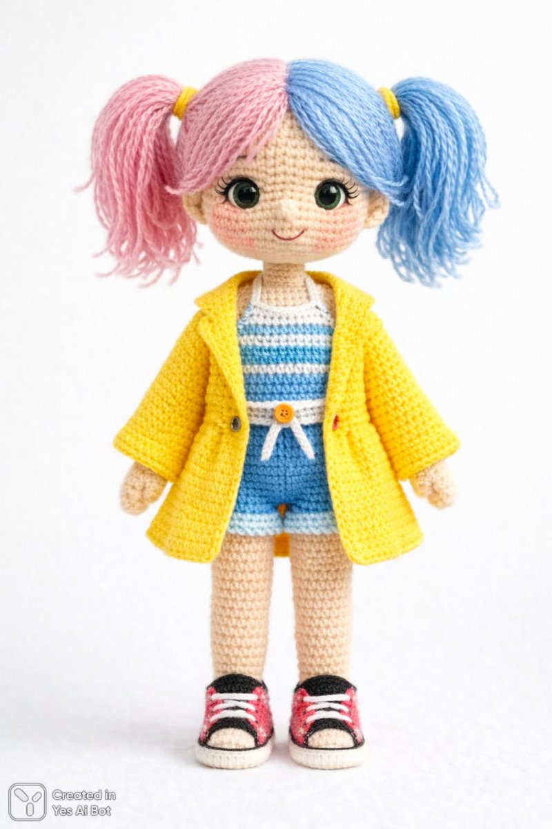 crocheted doll with pink and blue hair in pigtails, wearing blue and white striped swimsuit with halter neckline and high-waisted shorts, yellow coat cinched at waist with small orange button, pink and black sneakers, standing on white bg, small smile on face, looking directly at camera, high-quality, bright lighting, capturing vibrant colors and beach theme details.