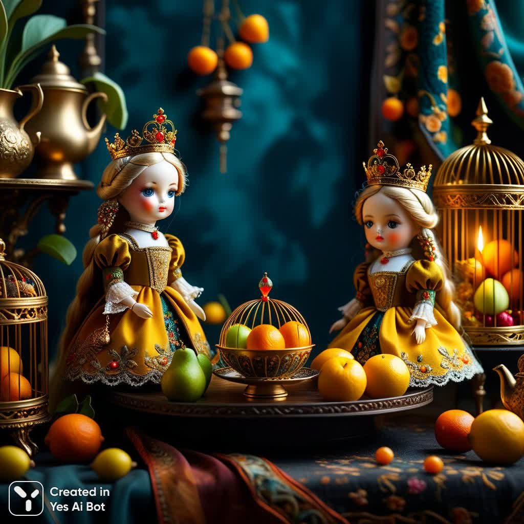 A vibrant pair of whimsical, charming dolls wearing golden crowns, a tea set, a playpen with fruit, a small golden canary cage, swirl-like textile images with embroidered flora and fauna, a marble surface, narrative textile surrealism, layered textures, warm theatrical lighting, a masterpiece, a captivating composition, intricate, detailed, the highest quality.