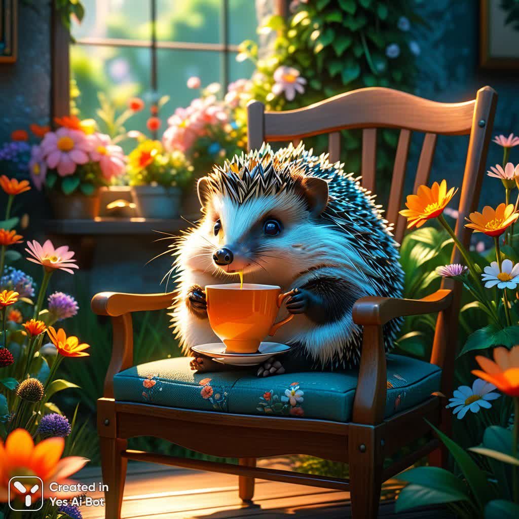A whimsical scene of a hedgehog sitting on a chair, drinking tea. The hedgehog is surrounded by a lush garden of flowers and birds, creating a peaceful and charming atmosphere. The image is bright and colorful, with a playful and fantastical style. A world-class masterpiece, 4K, the best quality, anime art. Overall, this is an absolute world-class masterpiece inspired by anime. It is an aesthetically pleasing anime work with impeccable attention to detail and beautiful composition.
