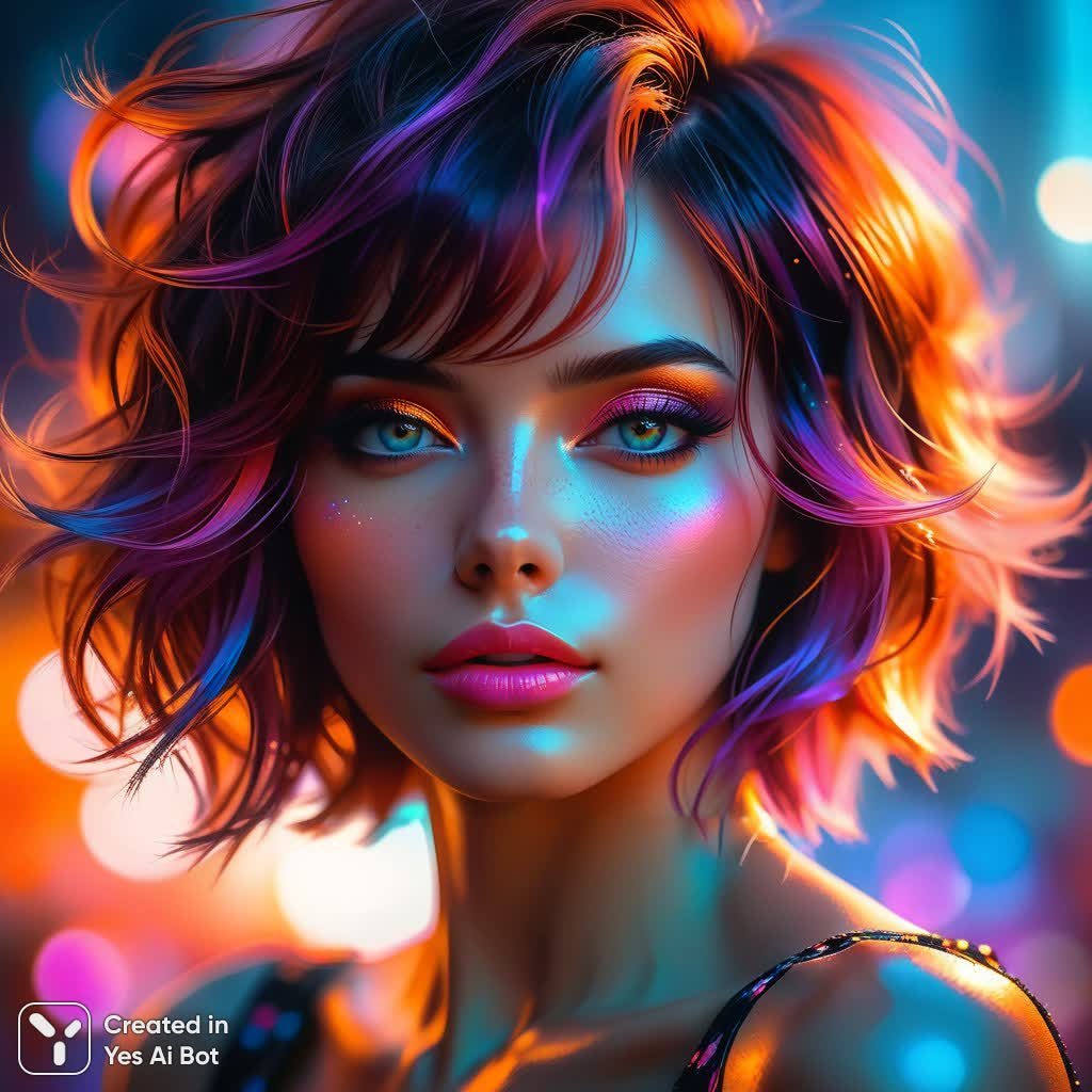 watercolor acrylic random pose of a woman with an asymmetrical bob haircut of saturated bright copper color tousled by the wind . She has smooth, flawless skin, delicate pink lips, dark eyeliner and well-defined eyebrows. The facial expression is confident and a little mysterious, the head is slightly turned to the right, the background is filled with a side effect of multicolored luminous circles of purple, pink, blue and white shades, creating a dreamy, bright atmosphere.