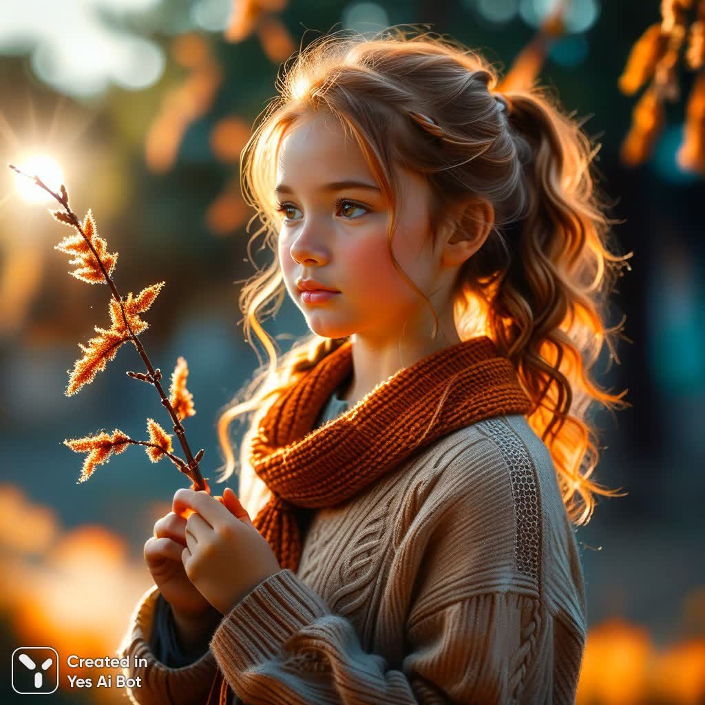 Завораживающий портрет юной девушки, выполненный в акварельно-акриловой технике, излучает тепло и умиротворение. В случайной позе она застыла в момент задумчивости, ее длинные кудрявые волосы цвета светло-медного золота собраны в аккуратный хвостик, перевязанный коричневой лентой. Мягкий свет ласкает лицо, создавая эффект рассеянного сияния и деликатного блика солнца. Девушка одета в уютный теплый свитер насыщенного коричневого цвета с милыми пушистыми помпонами, придающими образу непосредственность и очарование. В руках она нежно держит изящную ветку ивы, словно созерцая ее красоту и таящуюся в ней мудрость. Выражение лица слегка задумчивое, полное тихой грусти и мечтательности, что притягивает взгляд и заставляет задуматься о ее мыслях. Фон размыт благодаря эффекту боке, создавая ощущение мягкости и воздушности. Преобладающие теплые оттенки коричневого и оранжевого усиливают атмосферу уюта и тепла, погружая зрителя в мир спокойствия и гармонии. Эта работа – не просто портрет, а целая история, рассказанная без слов, полная нежности, мечтаний и тонких переживаний молодости. Картина словно переносит нас в солнечный осенний день, наполненный тишиной и покоем. Идеально подходит для тех, кто ценит красоту простых вещей и утонченность художественного исполнения