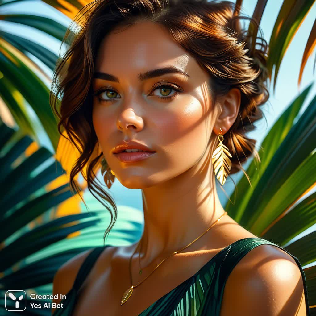 Завораживающий акварельно-акриловый этюд запечатлевает момент случайной позы: женщина с каштановыми волосами, уложенными в небрежный пучок, частично скрыта за экзотической пальмовой листвой. Ее образ дополнен элегантным темно-зеленым платьем без бретелек и минималистичными золотыми украшениями – изящными прямоугольными серьгами-подвесками и утонченным кулоном на цепочке. Композиция снята под небольшим углом, что акцентирует внимание зрителя на выразительном взгляде модели, словно приглашая в мир ее мыслей и чувств. Мастерское использование светотени – техника кьяроскуро – создает драматичный эффект, подчеркивая глубину лица женщины. Яркий, резкий свет, имитирующий проникающие сквозь листву лучи солнца, формирует причудливую игру теней на ее лице, добавляя изображению объемности и реалистичности. Этот фрагмент – не просто портрет, а поэтическая зарисовка, наполненная таинственностью и красотой природы, где человек становится частью гармоничного пейзажа. Вся работа пронизана атмосферой спокойствия и умиротворения, позволяя зрителю на мгновение погрузиться в мир грез и фантазий, ощущая легкое дуновение тропического ветра. Использование смешанной техники придает работе особую фактурность и живость, делая ее уникальным произведением искусства